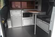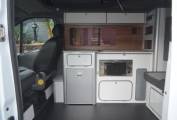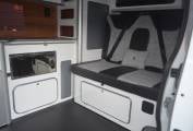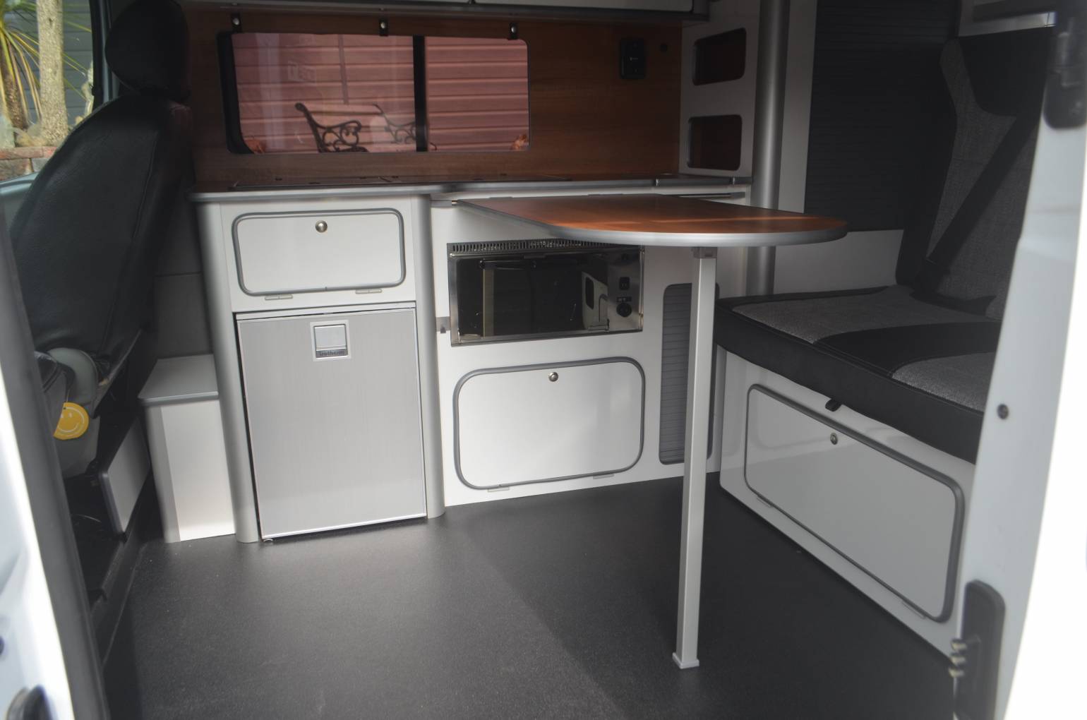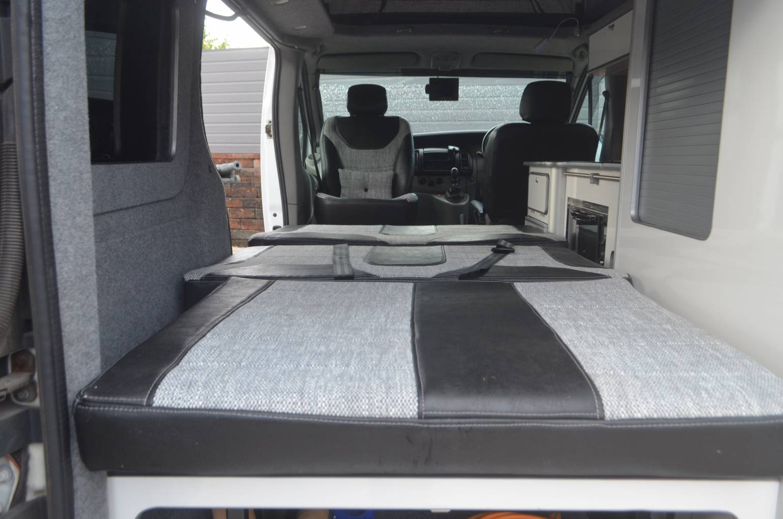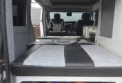 The rock n roll bed converts into a double bed and the other 2 sleeping places are above in the pop top roof. There is a stowaway table for the lounge area and the front passenger seat will swivel round to the table.