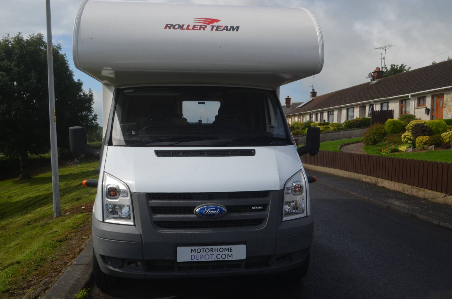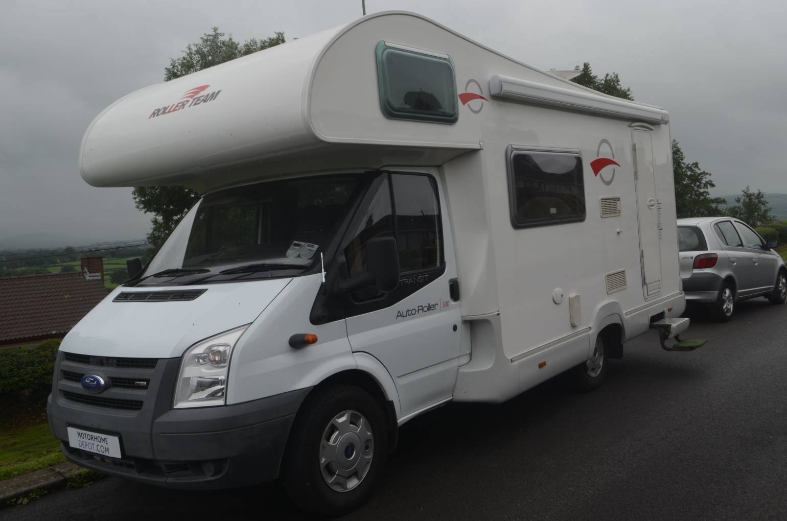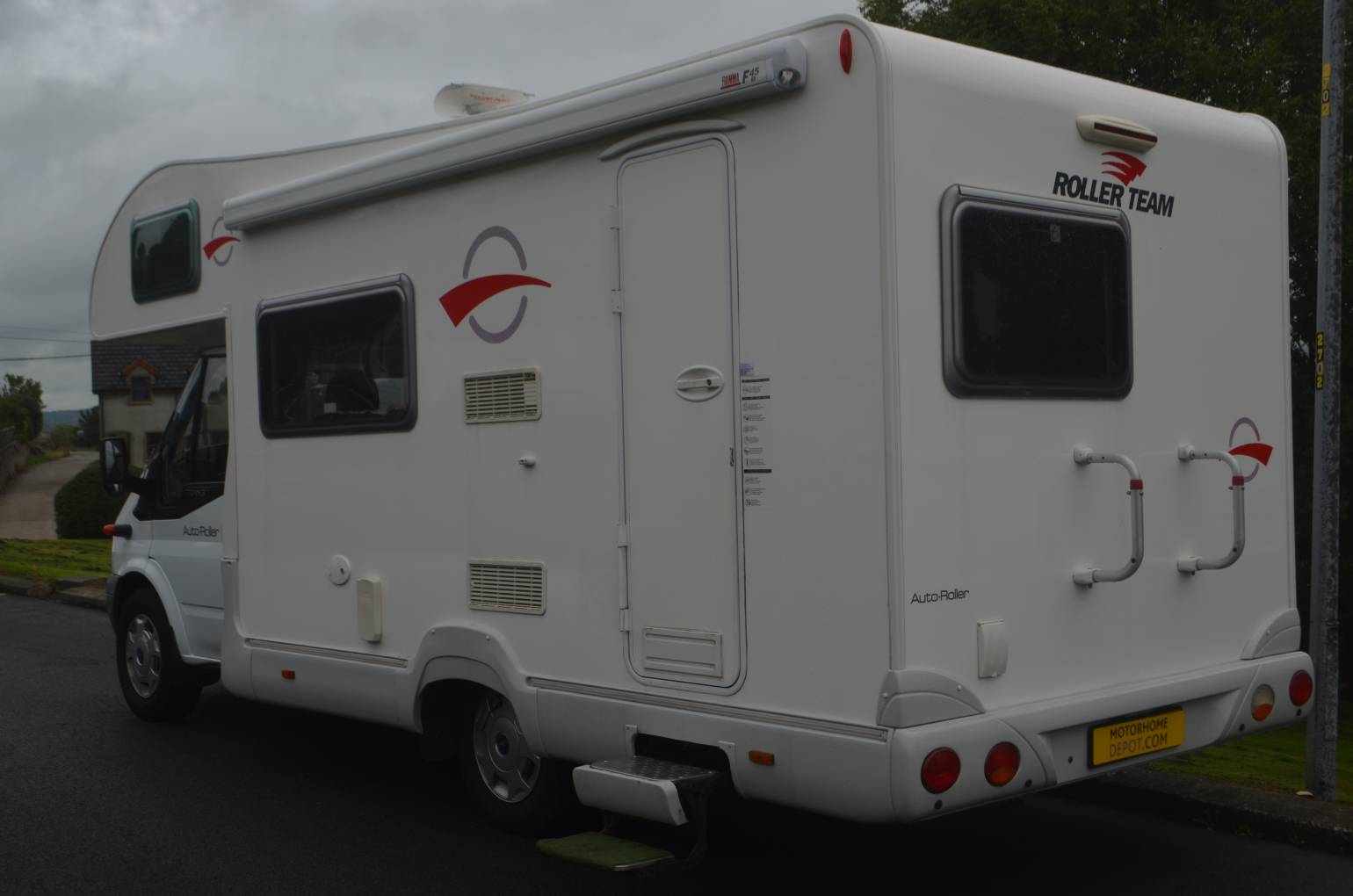 2007 Roller Team Autoroller 500 FOR SALE. Based on a Ford Transit chassis with 2.2 litre engine and 5 speed manual gear box. This Low mileage motorhome is showing 18,329 miles at present. Presented in great condition the Auto Roller will accomodate up to 5 people with 6 travelling seatbelts. Maximum weight is 3500kg. Great layout for a family or couple travelling. The cab area has electric windows, electric mirrors, reverse camera, radio and swivelling captain seat. The popular kitchen layout is at the rear of the motorhome and is equipped with a 3 hob burner, oven, grill, full sized sink, drainer and fridge. Above the cab is a large double bed with a comfortable lounge that easily converts into another double bed. The long bench seat will make up into a single bed. Your lounge area is very spacious with ample storage and wardrobe situated throughout the habitation area. Washroom is at the rear with a wash hand basin, toilet and shower cubicle. This model comes with a wind out awning attached.