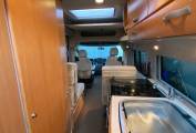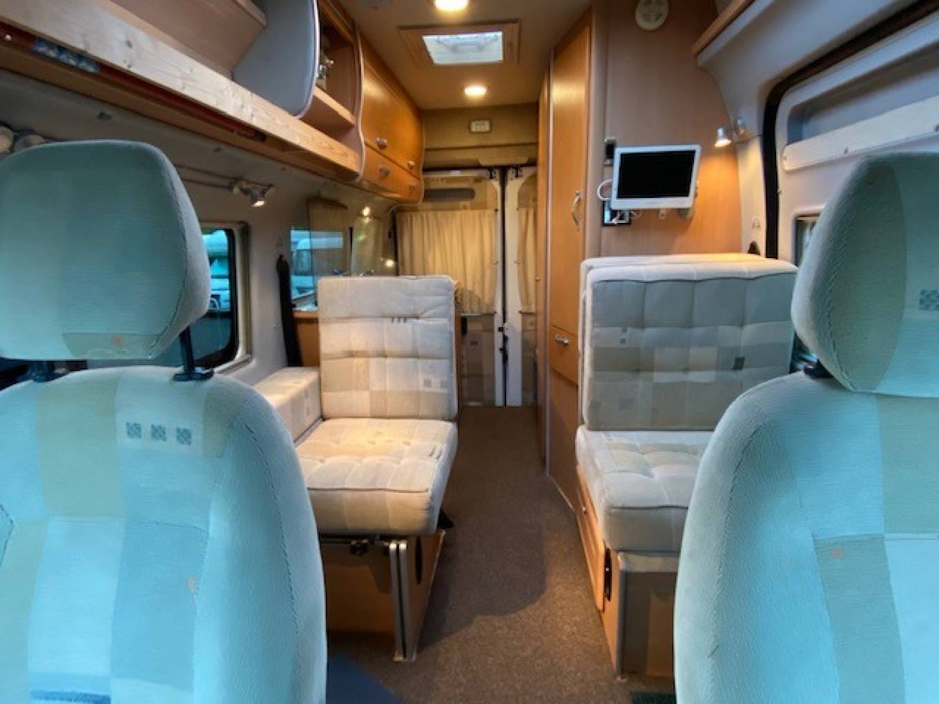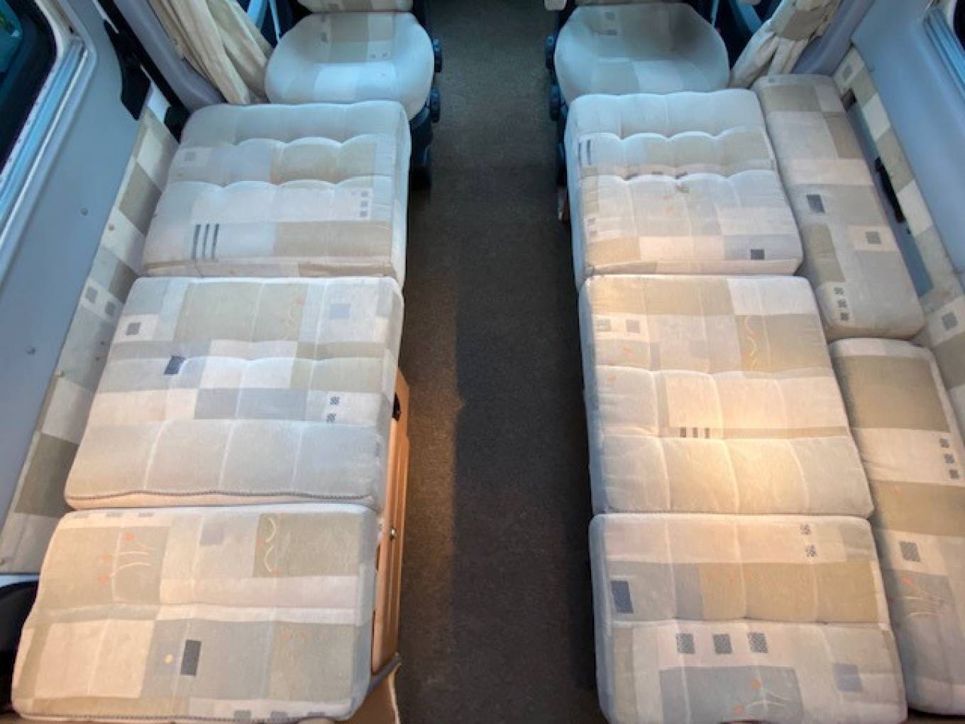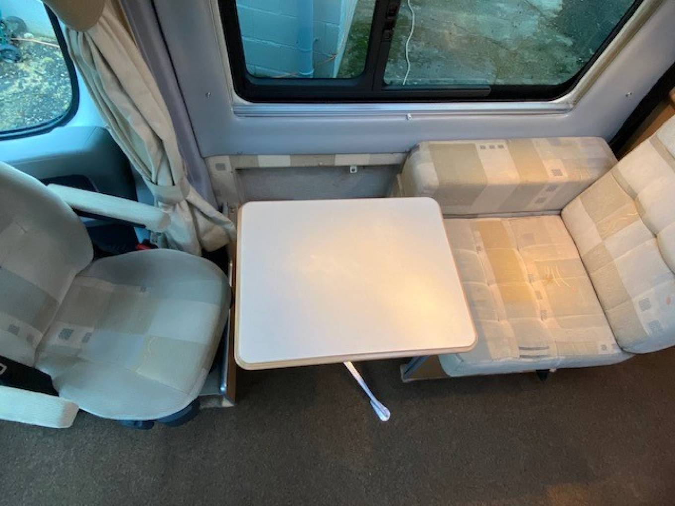 This compact van measures 5.4 m (17' 8") long and 2.8 m (9' 3") high and could be used as a day to day vehicle. On entering via the electric step and sliding door you find yourself in the living/dining area with two forward facing seats and 3 point seat belts, and a large sunroof flooding the area with light. The front seats swivel to create a larger living area with sociable seating for 4 people and there are two dining tables. There is a small TV in this area to watch in comfort and the current owner has added a clever (removable) sliding shelf enabling more storage in addition to the overcab cubby space. By night this area converts into 2 single beds measuring 210 cm (6' 8") x 75 cm (2' 4") and 200 cm (6' 5") x 63 cm (2' 0").