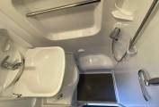 The washroom is located on the opposite side and consists of a shower tray with shower head on a rising rail, fold down wash basin with chrome mixer tap, a mirrored vanity cupboard and a Thetford cassette toilet with electric flush.