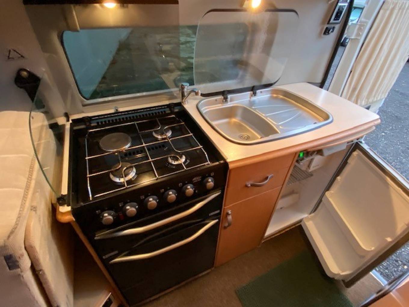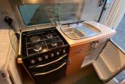 At the rear, the kitchen has a stainless steel sink with draining board, a retractable work top, chrome mixer tap and glass lid that can form another work surface; a hob with 3 gas burners and an electric hot plate, gas grill and oven; a three way fridge with ice box and plenty of storage cupboards for ingredients and cooking utensils.