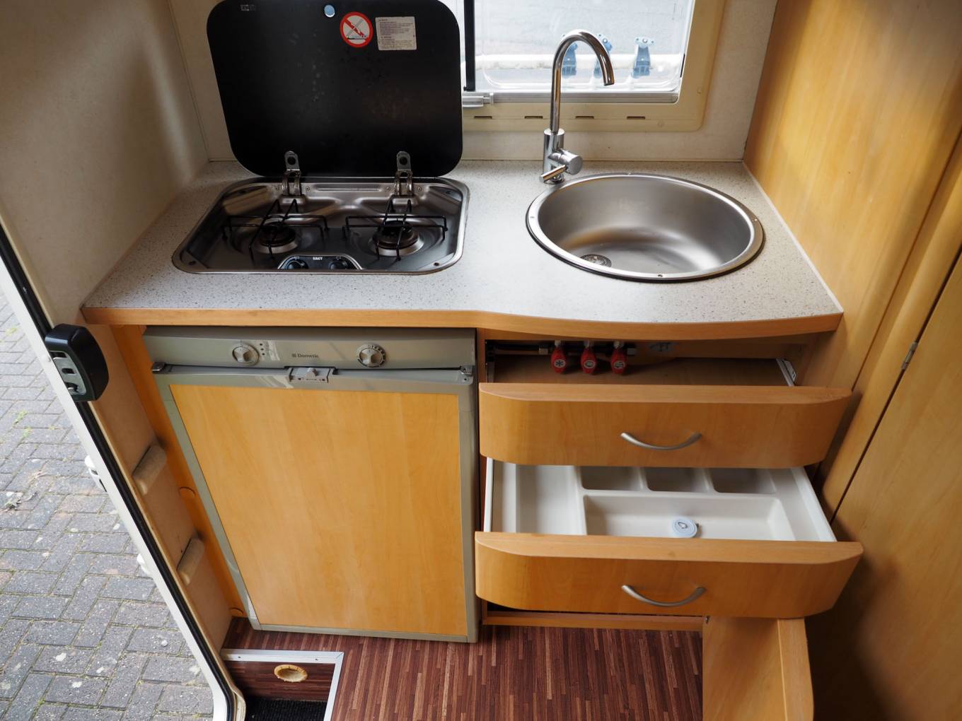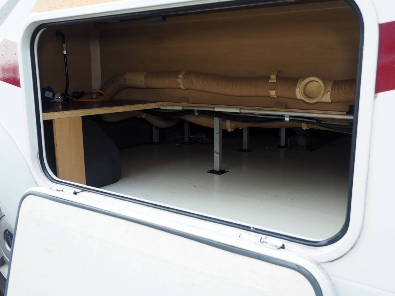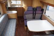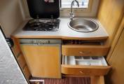 It has a light, roomy feel inside and there is plenty of seating in the large midships dinette. The front double bed is very generous, with the long bench making another single bed and dinette making a three quarter bed. At the rear is a decent sized kitchen with good storage, adjacent to the rear corner washroom offering toilet, vanity sink and solid lined shower. There is significant locker and underfloor storage, accessed internally or externally. Water tanks are internal, allowing for use in the winter season.