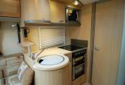 In the centre is a well equipped corner shaped kitchen with dual fuel hob, gas oven and grill, microwave and large fridge freezer. There is good storage here too above and below, plus a wardrobe and table storage.