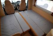 The cab seats swivel to meet the roomy dinette which has two bench settees, and there are two large skylights. There are plenty of openings and blinds to regulate light and temperature. The cab easily screens off at night time with integrated blinds and the large double bed is quick to make up without any fill in cushions. There is good storage under the seats for bedding too.