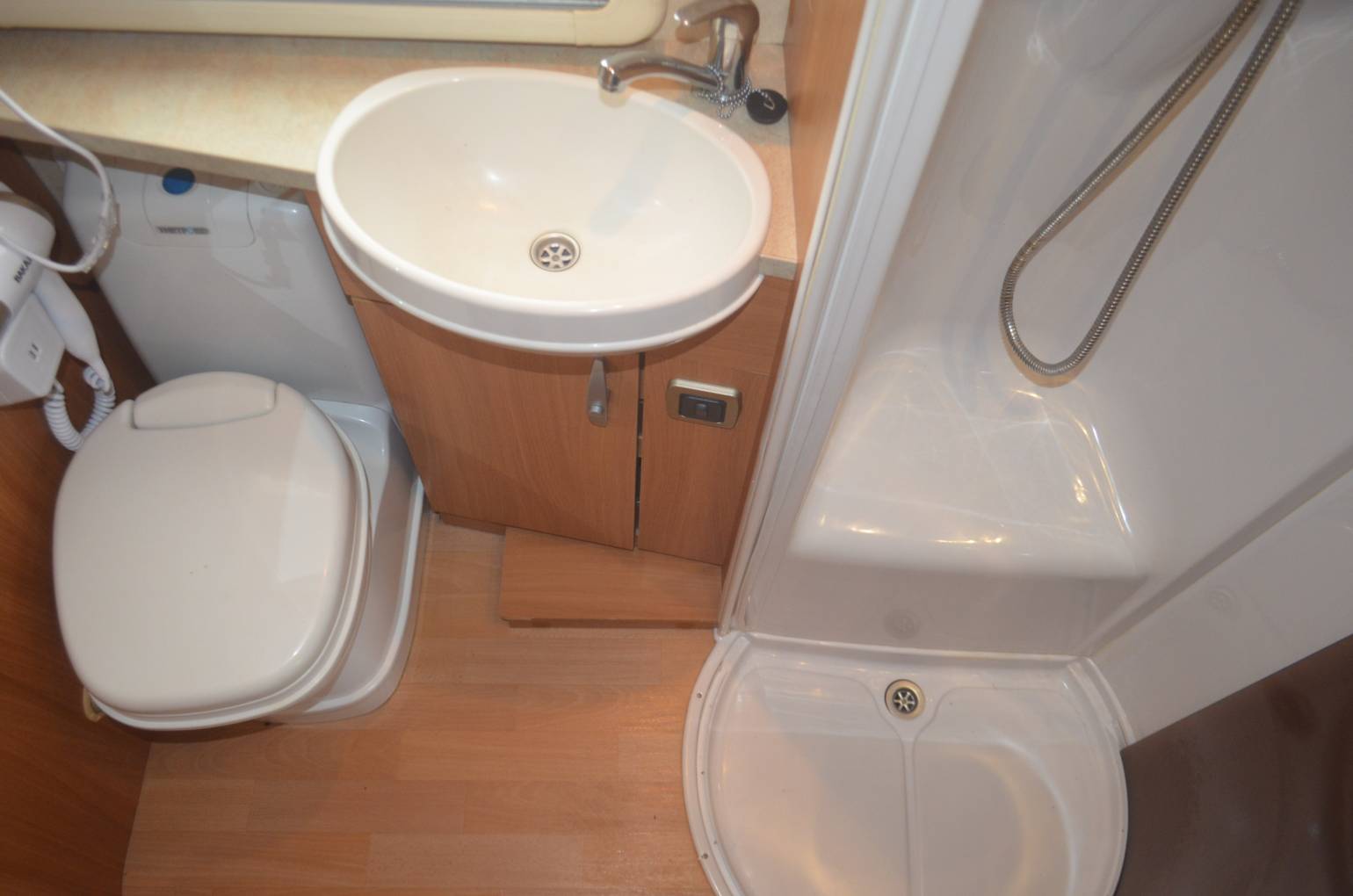 En suite bathroom has a separate shower, wash hand basin, cassette toilet and a vanity unit.