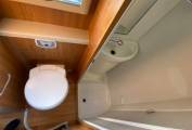 At the rear is the fixed corner (French style) bed and washroom with wc, sink and shower next door. The French bed measures 187 cm long x 122 cm at the widest point, narrowing to 100 cm.