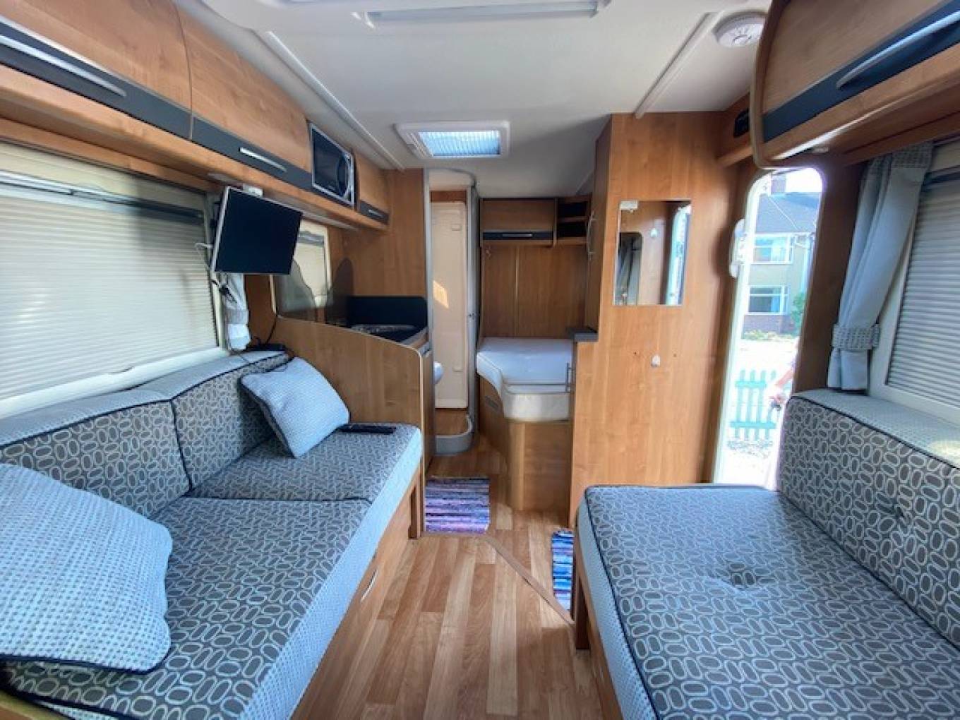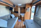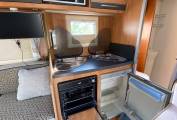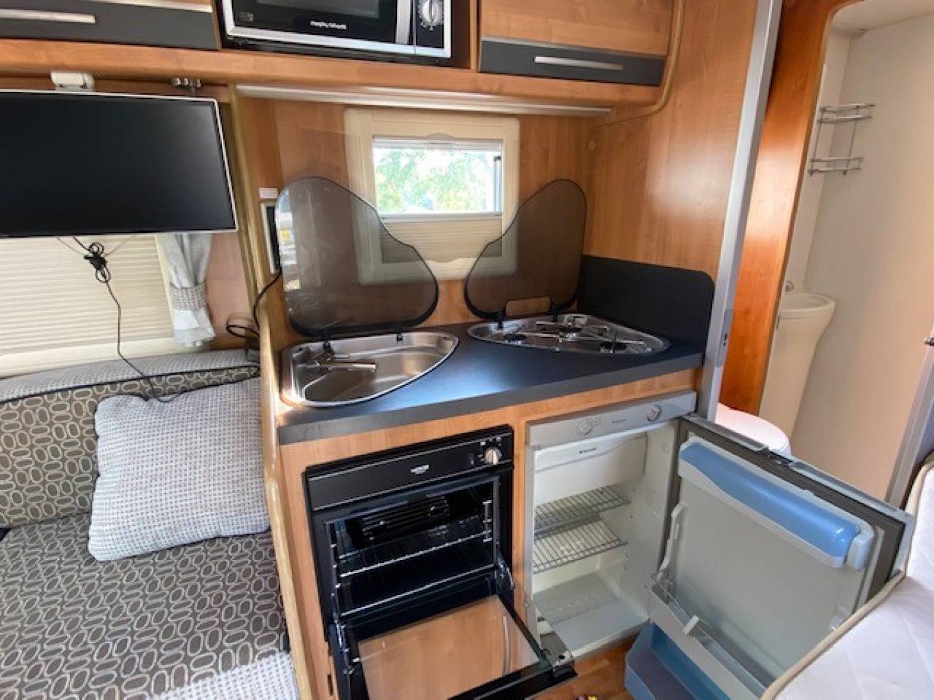 Although 4 berth, it is important to note that there are only 2 seat belts. The 2 bench seats act as a front lounge/dining area by day and can comfortably seat 4 people, with the driver and passenger seats swivelling to complete the dining area. A mounted TV affords some extra luxury. By night the bench seats convert to a small double bed. The kitchen is located between the lounge/dining area and rear bedroom. This consists of a 3 burner hob, grill, oven, sink, microwave and fridge with freezer compartment, as well as storage cupboards and drawers.