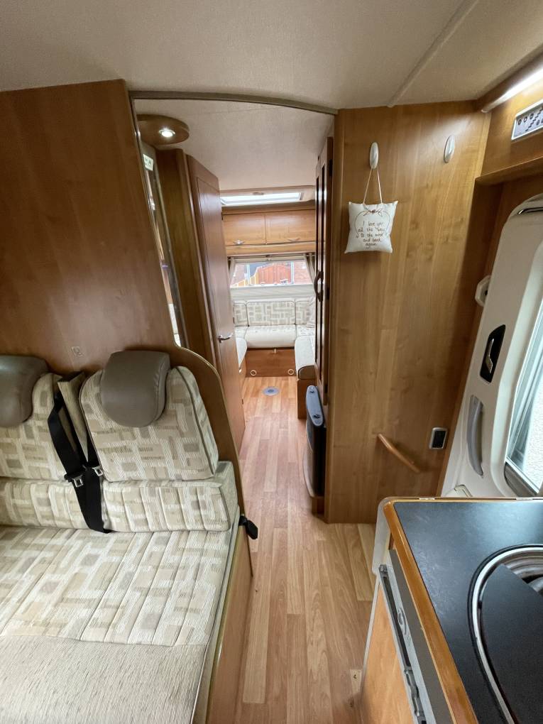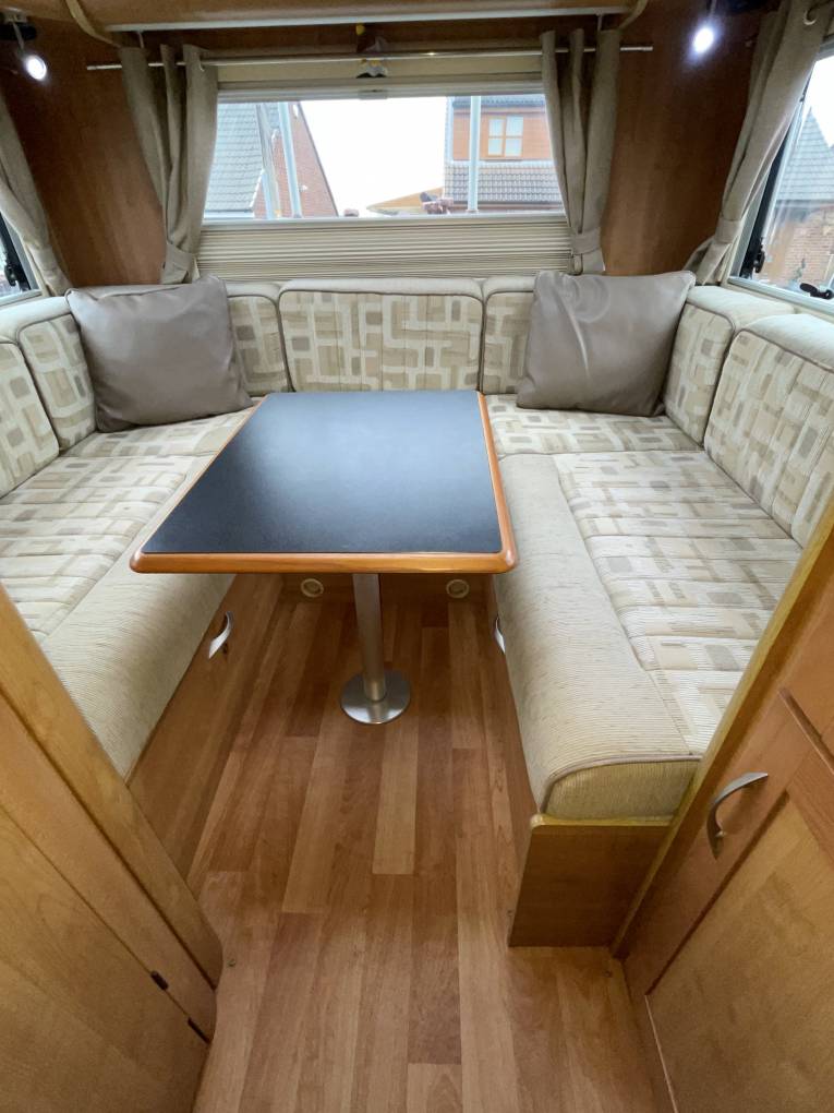The dining area at the front has two double seats and removable dining table to give you a comfortable and spacious seating & dining area. The kitchen area is very well equipped with a full-size oven, grill and hob (gas & electric). There are plenty of storage cupboards, a fridge/freezer and sink with mixer tap, A separate microwave is also stored in adjoining cupboard.
