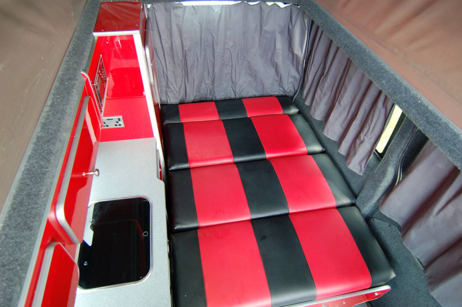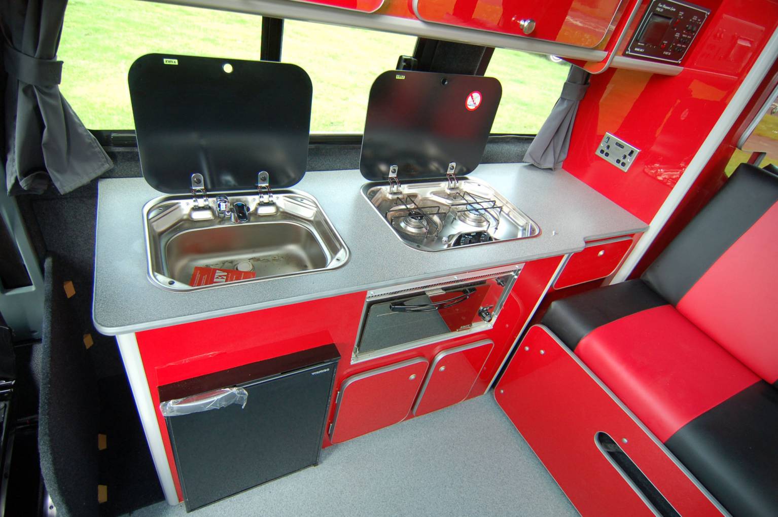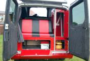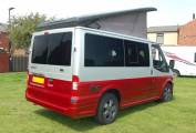 In striking attactive two tone silver and cherry paintwork with grey alloys, this newly converted Transit offers the classic poptop layout of side kitchen and storage, rising roof and twin belted rear bench seat making a rock and roll bed. Built as a two berth, its size makes it good as a dual purpose vehicle, yet has the facilities to be used for long weekends or just days out. Featuring a swivel passenger seat, two burner gas hob, 12v fridge, gas grill, cold water system and full 12v and 230v electrics, it also has a removable centre table in the dinette adjacent to the side sliding door.