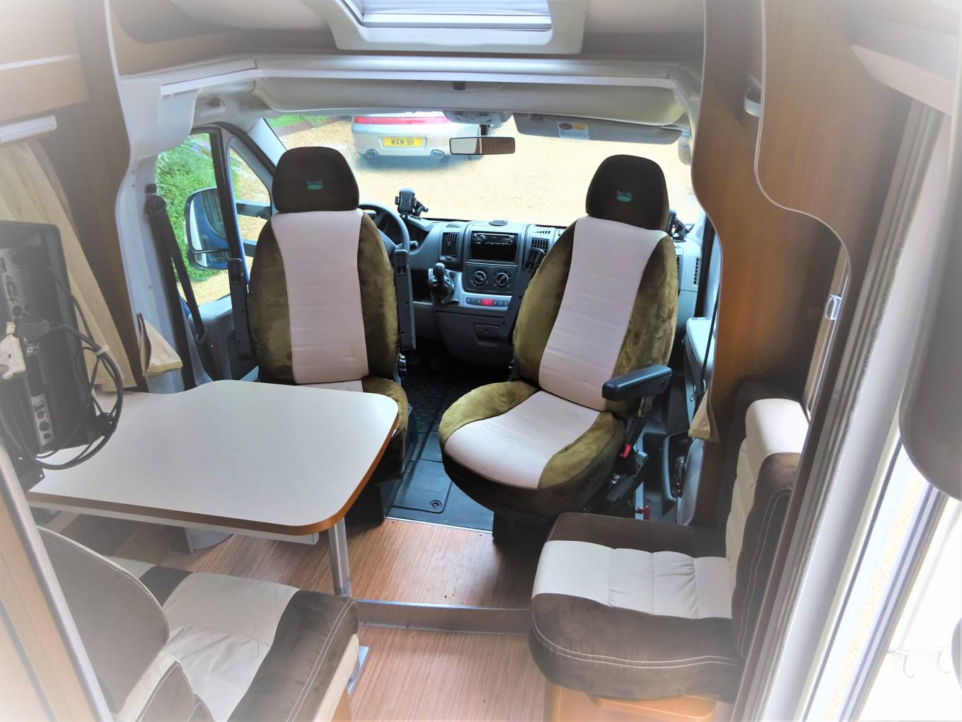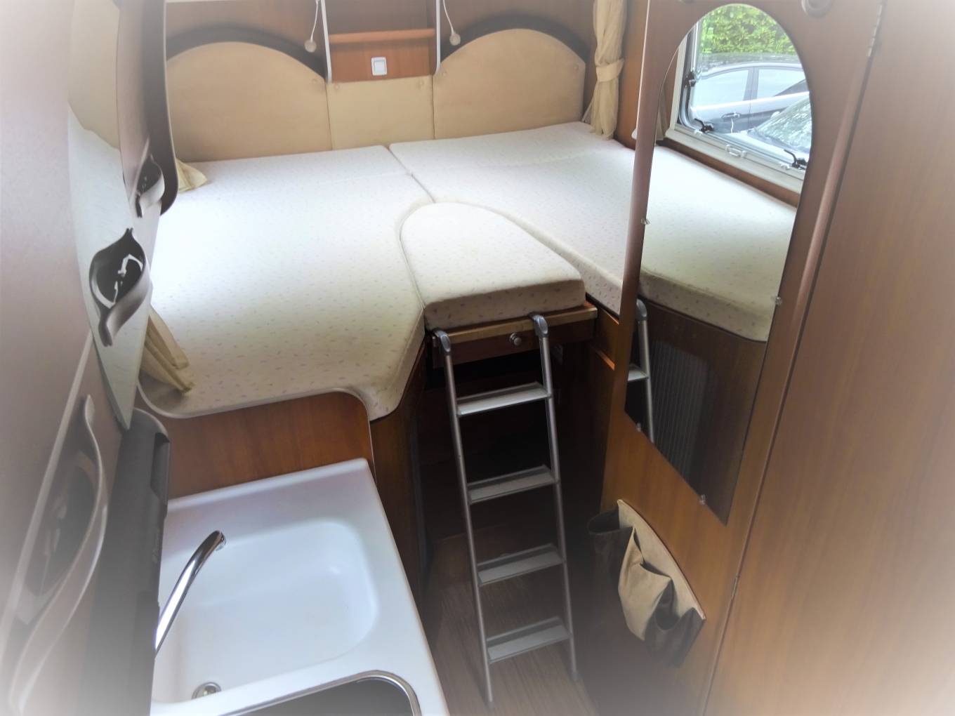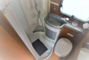 The mid kitchen caters for all your needs including gas hob, kitchen sink and drainer with hot and cold water, 3 way fridge and freezer compartment. Moving forwards, the dinette area has seating for 5/6 with the front seats swivelled and easily converts to a double bed for your sleeping comfort. The upholstery is in great condition and comfy for those evenings watching the TV or having a glass of wine. There is also a satellite receiver on board so you don’t miss your favourite programme.