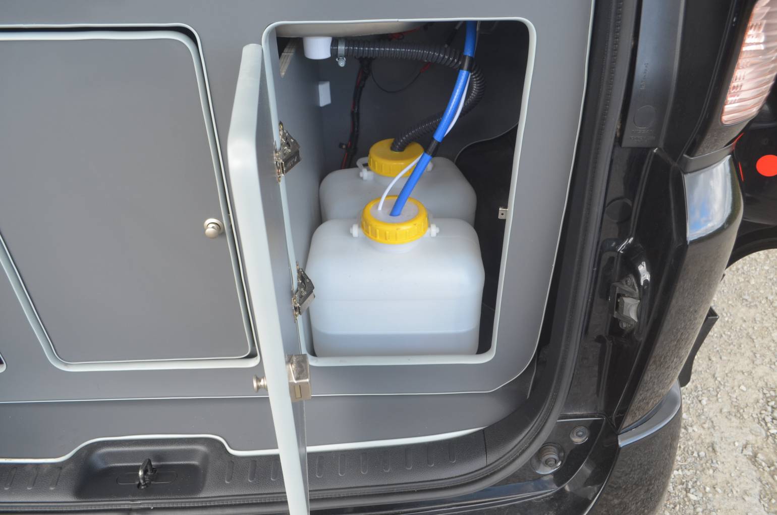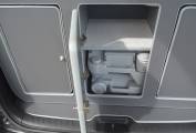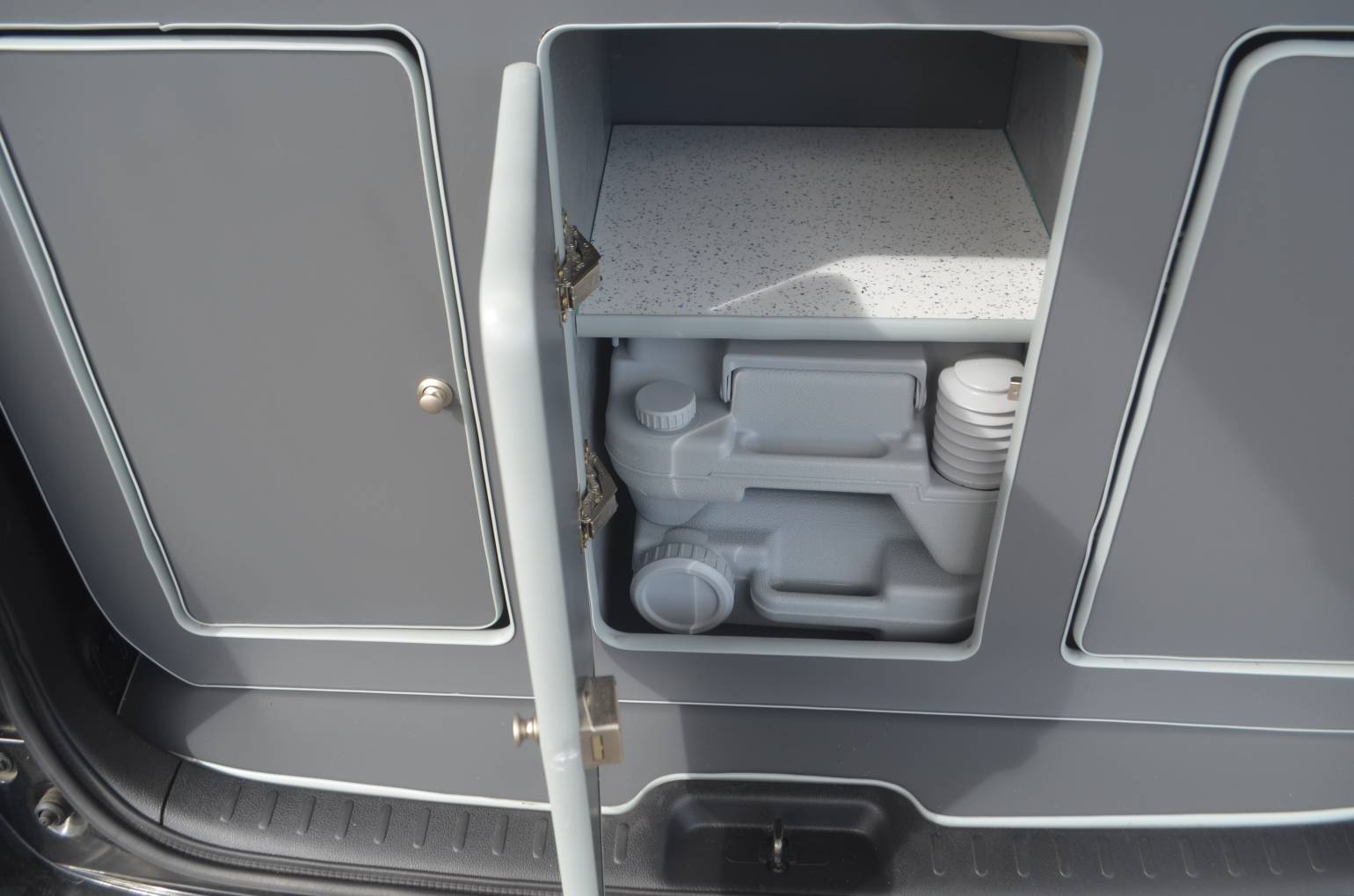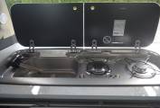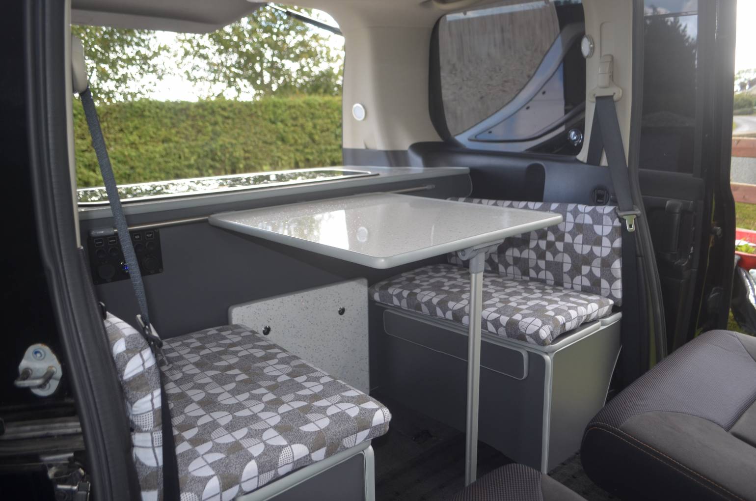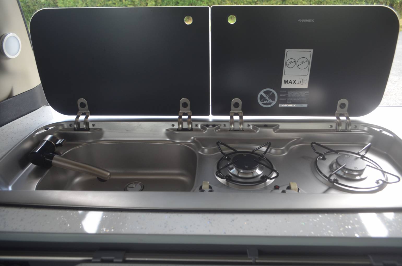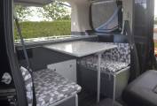 Sleeping places for 2 people. The kitchen is built into the rear of the camper with a 2 burner gas hob, sink with running water and a removable table with bench seats. The side doors are electric and open automatically.