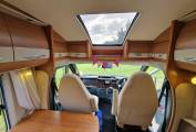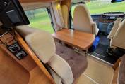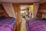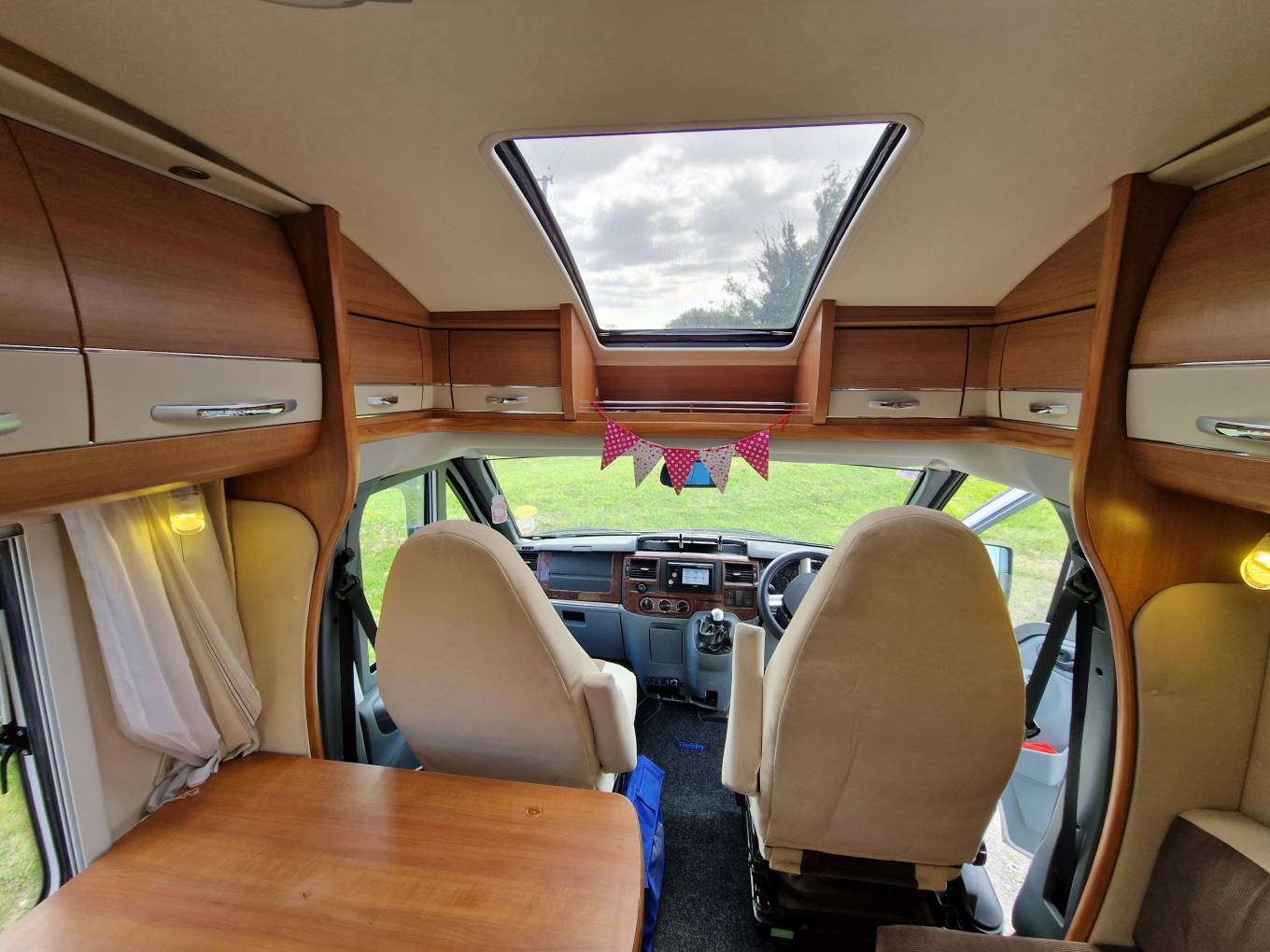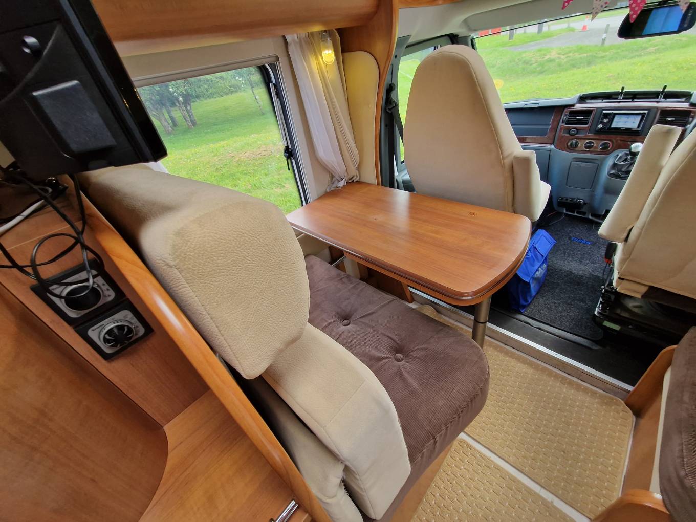 Internally it has rear fixed beds that can be used as two single beds or can be converted into as a large double bed with some cushions. There are two captain swivel front seats that help create a front dining area with the other seats being a double seat (with 2 seatbelts) and a single side seat. Which all surround a removable/extendable table that creates a dinning area for 4/5 people. The area can also be converted into a single sleeping area if needed.
