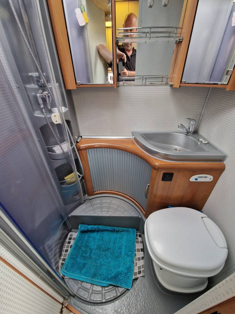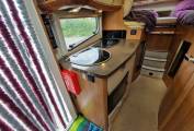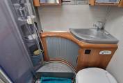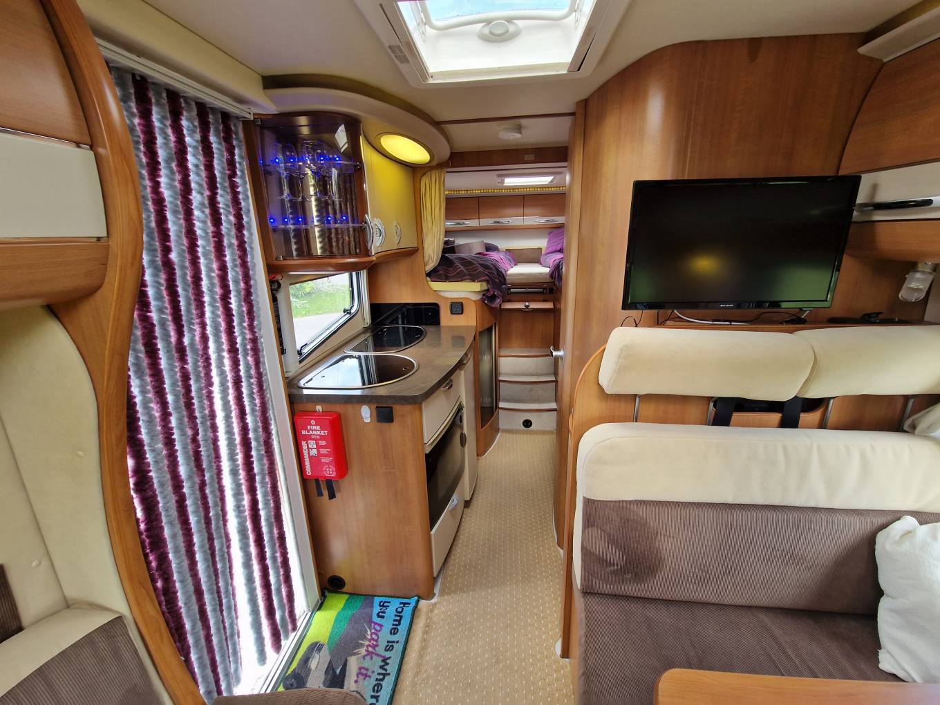 The central kitchen area enjoys a large fridge freezer, 3 gas burner stove and a sink with mixer tap. Opposite is an attractive washroom comprising sink, Thetford toilet and shower cubicle.