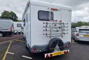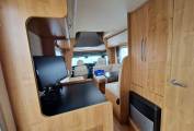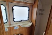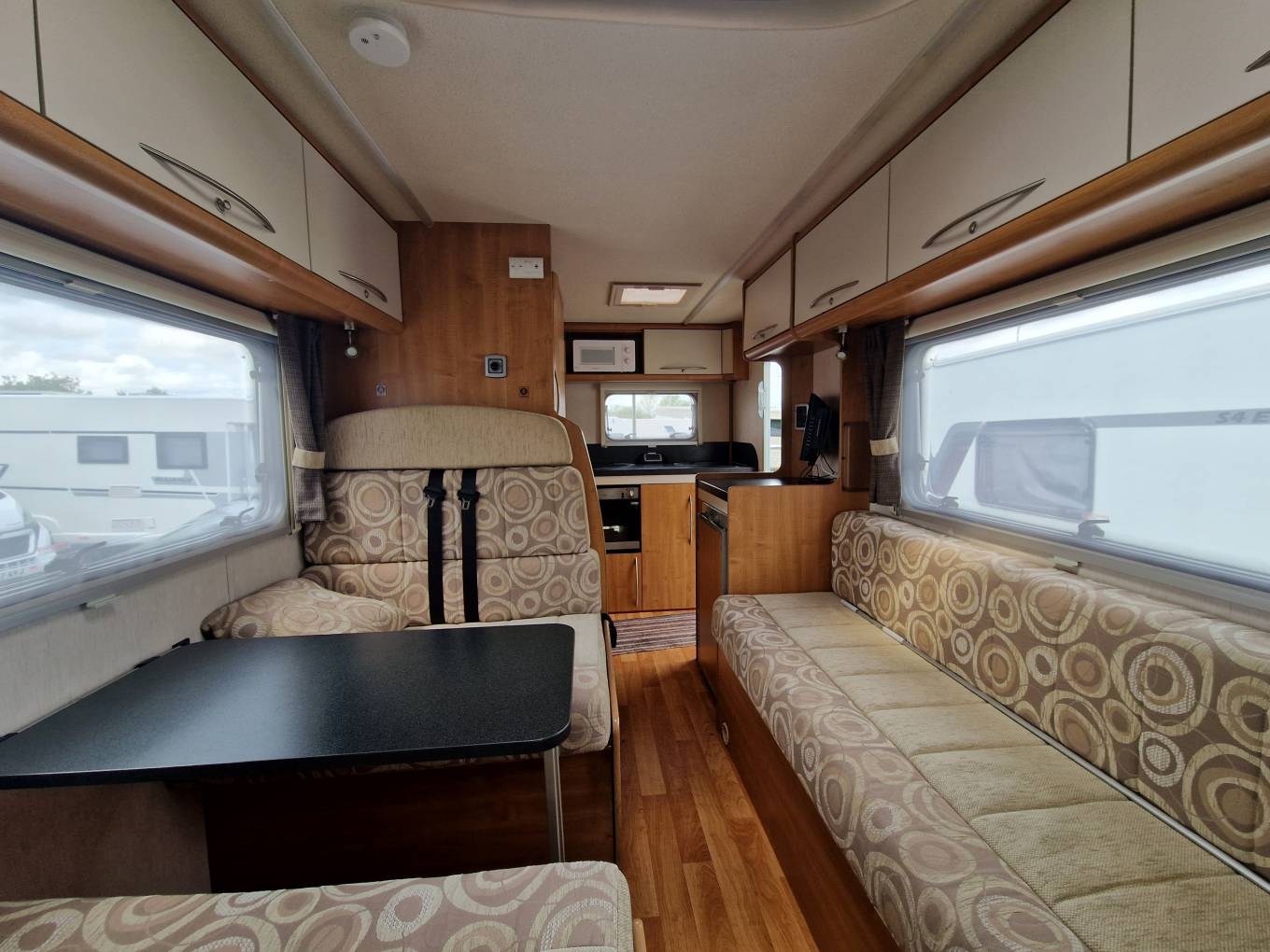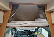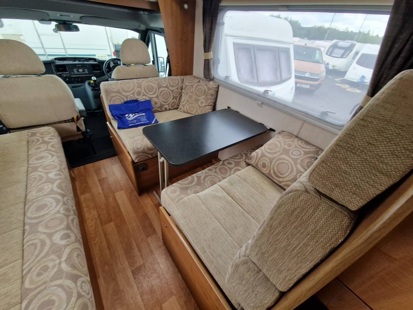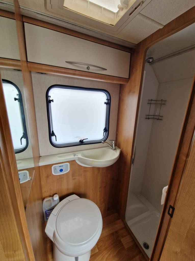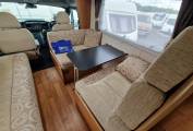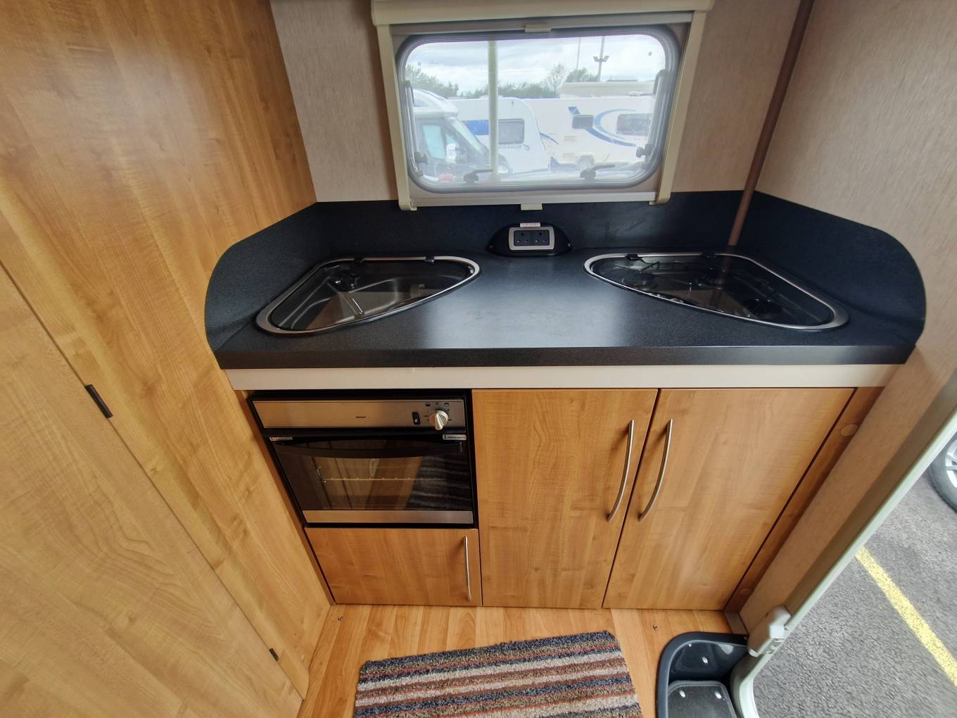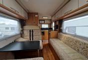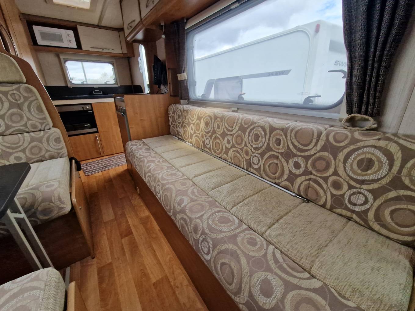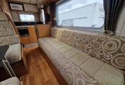 The layout comprises of a generous overcab double bed, central seating group with table and side settee which converts into a double and single bed if required, rear washroom including lined shower cubicle, toilet and vanity sink, plus an end kitchen having 80 litre fridge, gas hob, oven and grill and microwave.