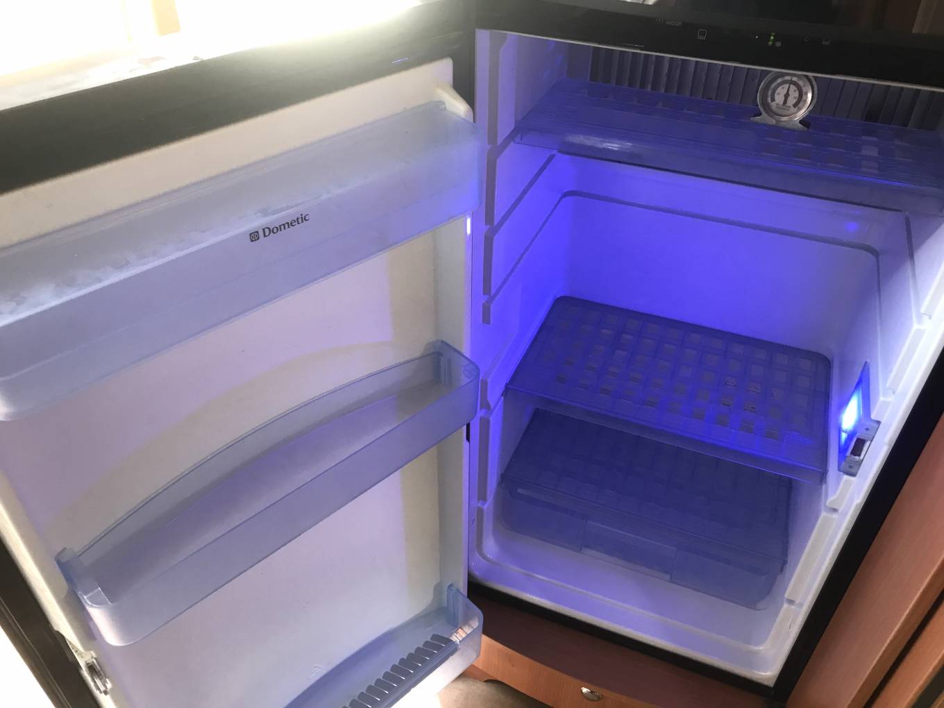 Kitchen includes a large fridge with separate freezer, small oven/grill, sink, hob with 3 gas rings and plenty of storage.