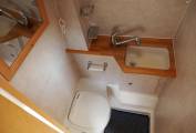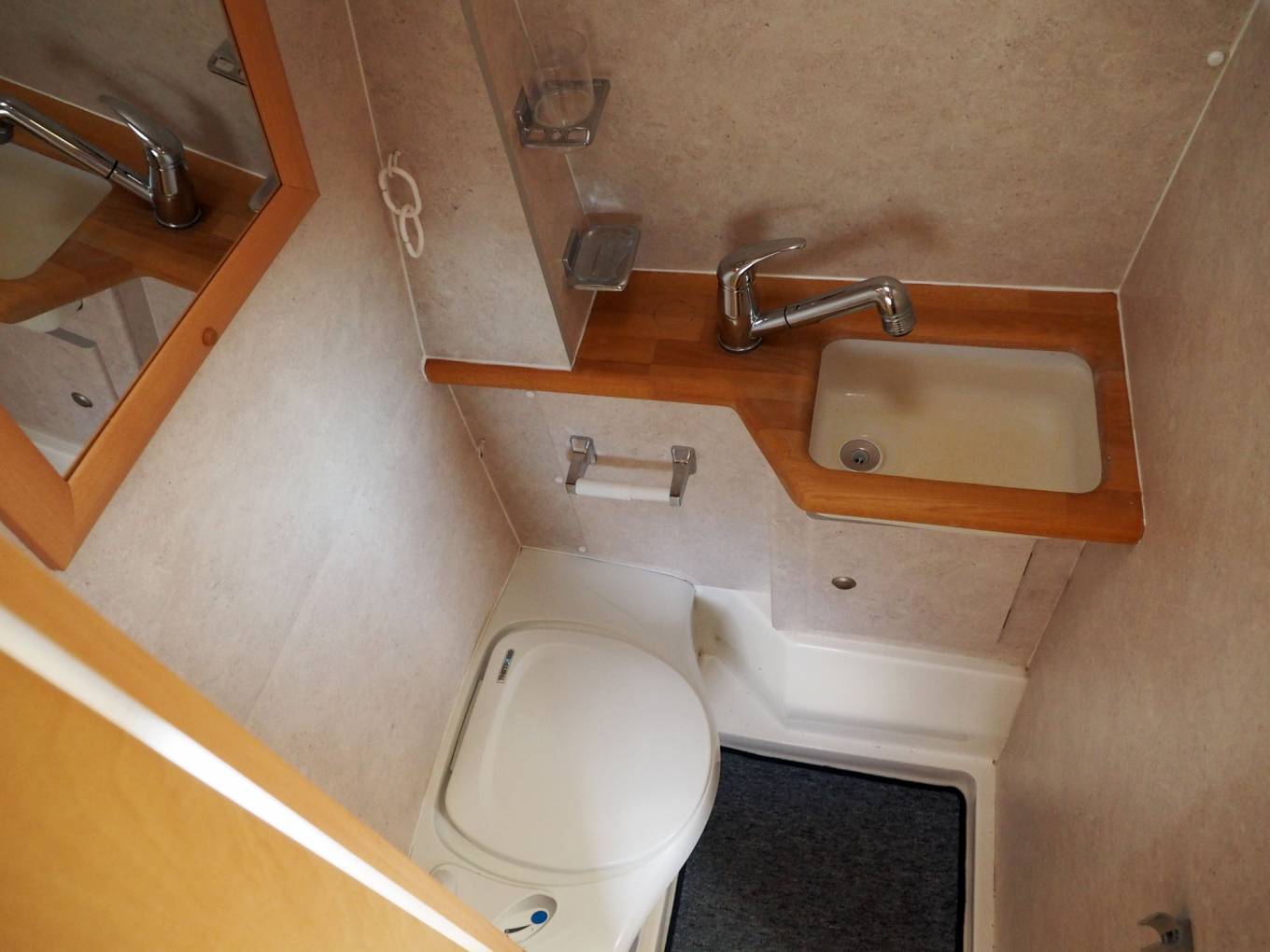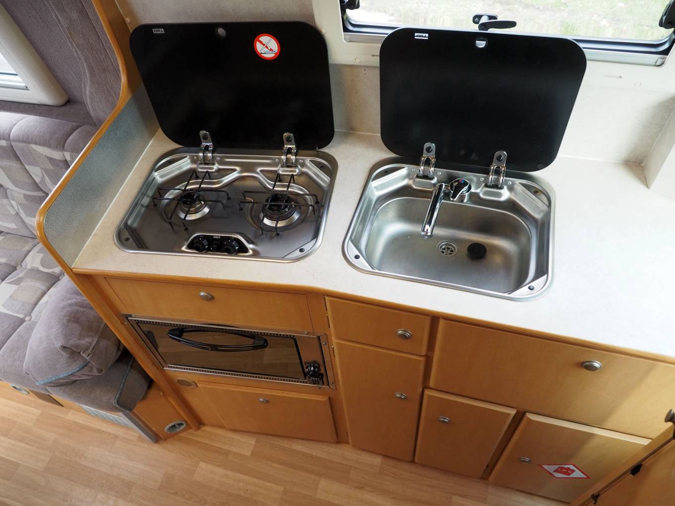 Featuring a side settee, swivel passenger cab seat and another forward facing rear seat, the dinette is a great place to relax with the sliding door open as you survey your chosen vista. To the rear is a well planned kitchen area with twin burner gas hob, mini grill and oven, fridge and a good array of storage, opposite the washroom with pull up shower head from the vanity sink and a Thetford toilet. Domestic gas is supplied via a Gaslow installed refillable bottle, the gas costing a fraction of exchange LPG bottles. There is the full compliment of onboard systems including fresh and waste water tanks, powerful dual fuel heating and hot water systems, full electrics with charger.
