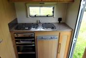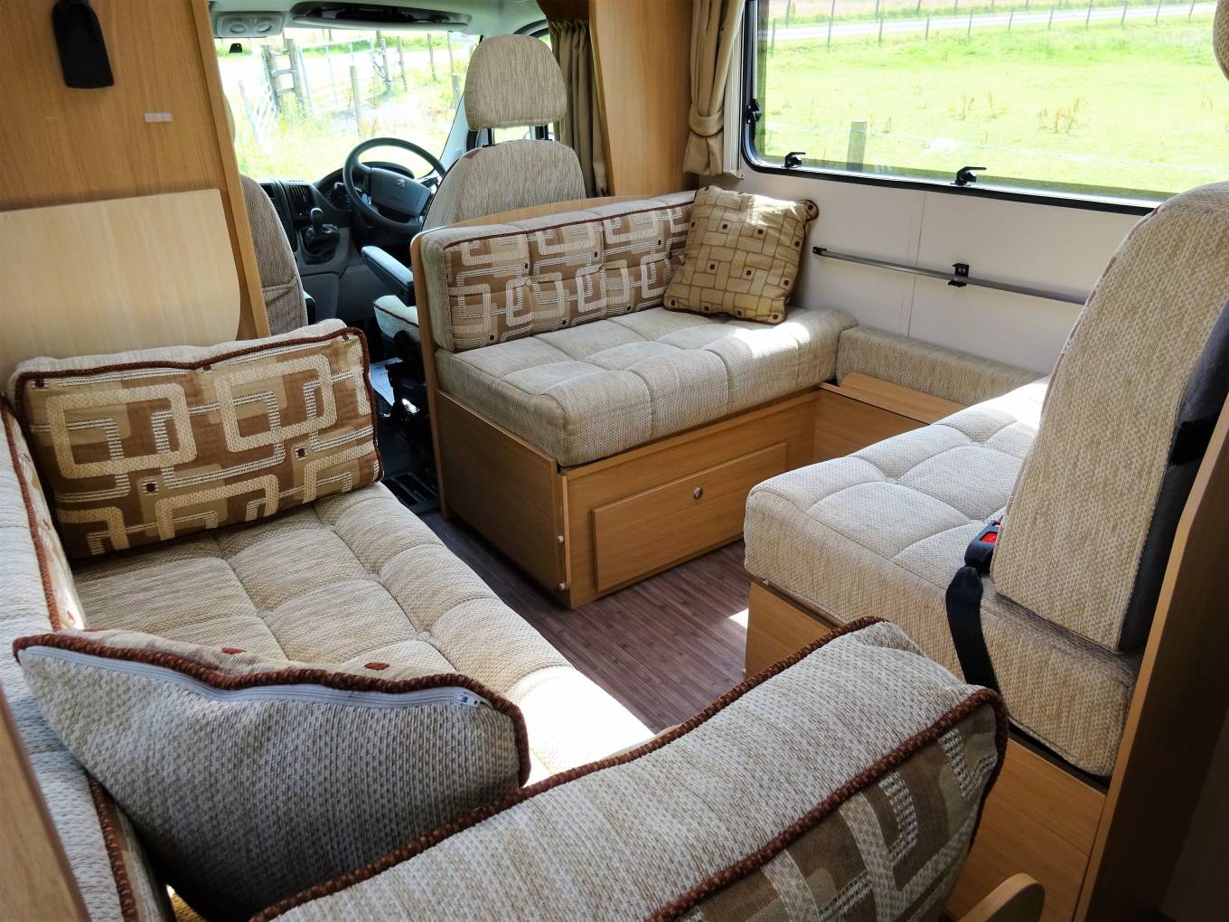 The apparently short chassis is almost tardis like once inside, with an over cab bed and roomy lounge dinette and separate sofa, that comfortably accomodates 4 people to live/sleep and with the benefit of 4 safety tested factory fitted seatbelts.