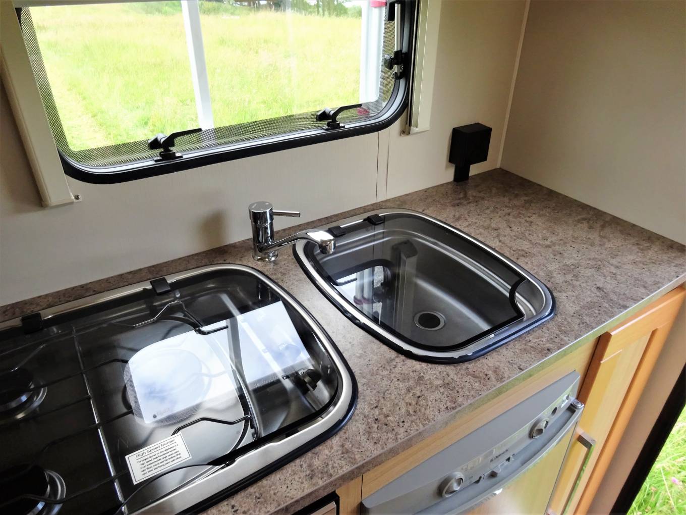 To the rear of the vehicle is a kitchen, with the expected hob, oven, grill and fridge/freezer and this coupled with plentiful storage lockers, means that you can cook up a feast. The entry door is next to the kitchen, meaning that you can cook with the door open and bring the outdoors in and keep cooking smells to a minimum.