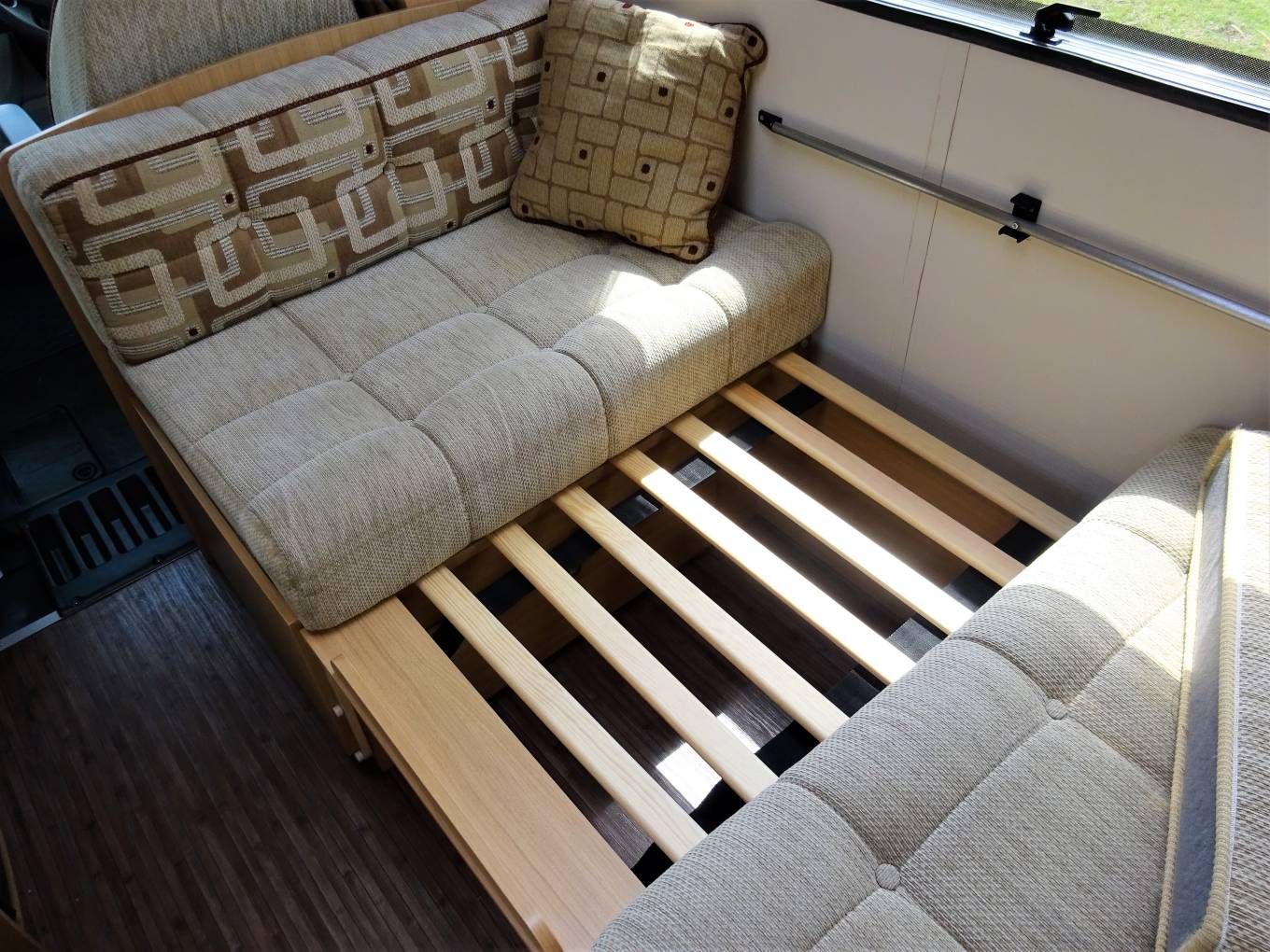 There is a double bed above the cab; accessed by a ladder that is stored away when not in use. The dinette area turns into a second double.
