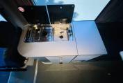 To the rear of the camper van is the washroom. The washroom consists of a shower, washbasin and toilet. Next is the dinette, which seats 4 and is the perfect place to relax. When the night draws in the dinette converts to a comfortable bed for 2 and above is the pop top which also sleeps 2. Completing the 4 berth. To the front is the kitchen. This includes a gas hob, wash basin, and a space for a fridge or cool box. The Camper Van features hot and cold water, webasto heating, 400 watt solar panel and cruise control.