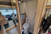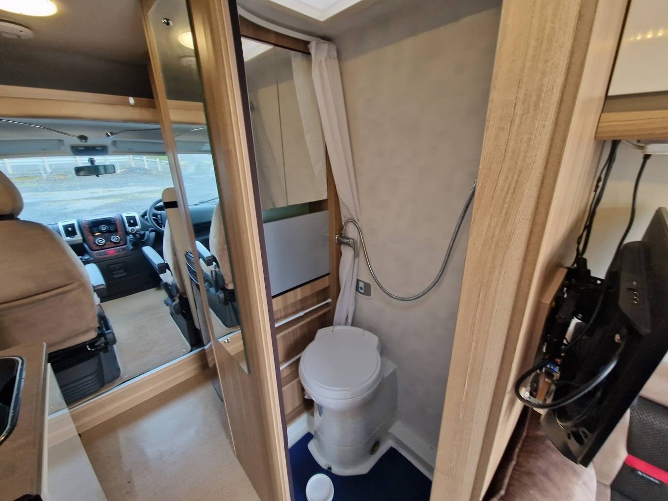 Opposite is the washroom which is a good size compared to any of its rivals, specification includes a tip-up fold away wash basin with mixer tap, a SOG onboard toilet with electric flush which removes the need for chemicals, integral shower with shower curtain, mirrored medicine cabinet and with a skylight above.