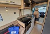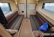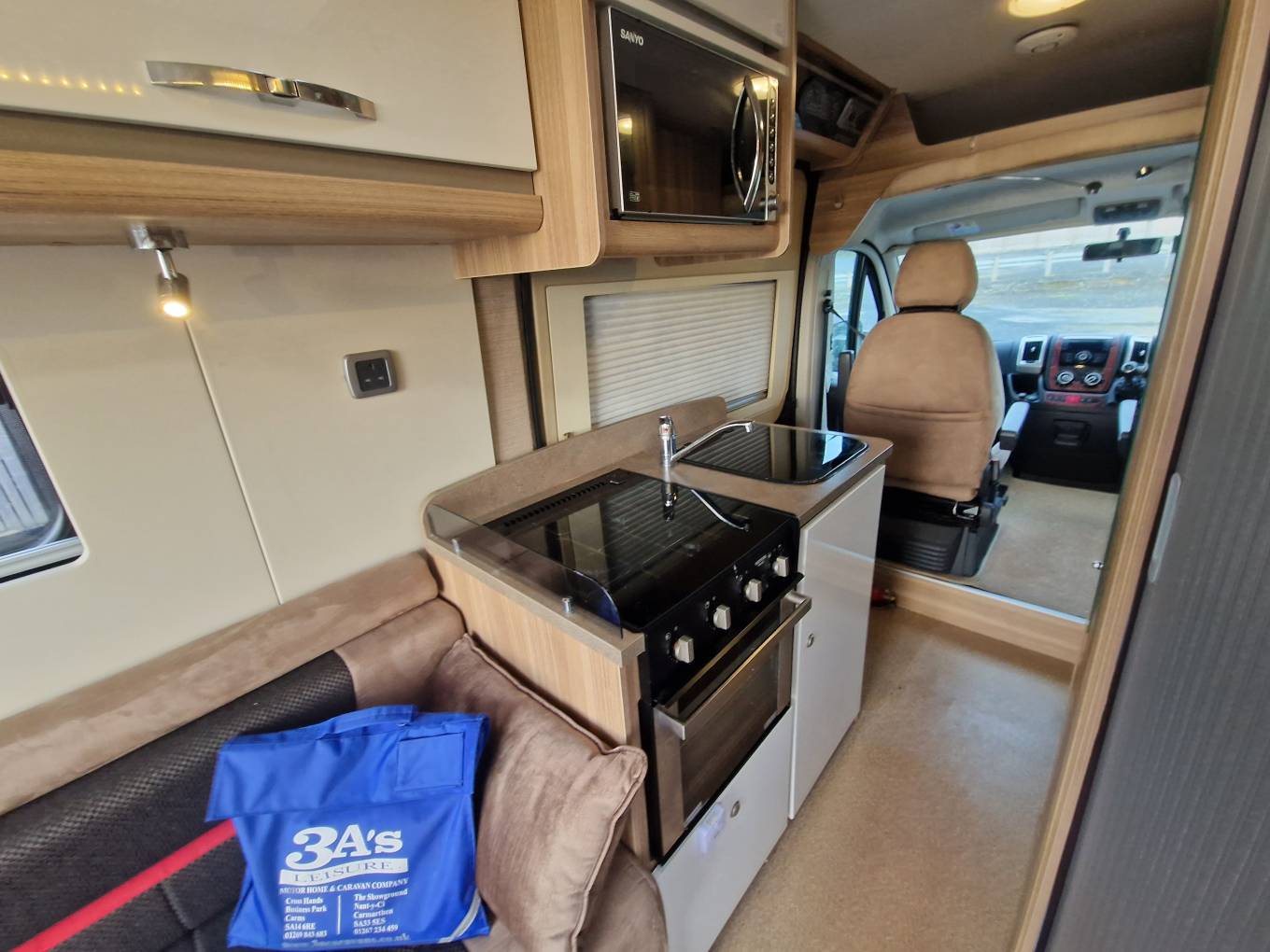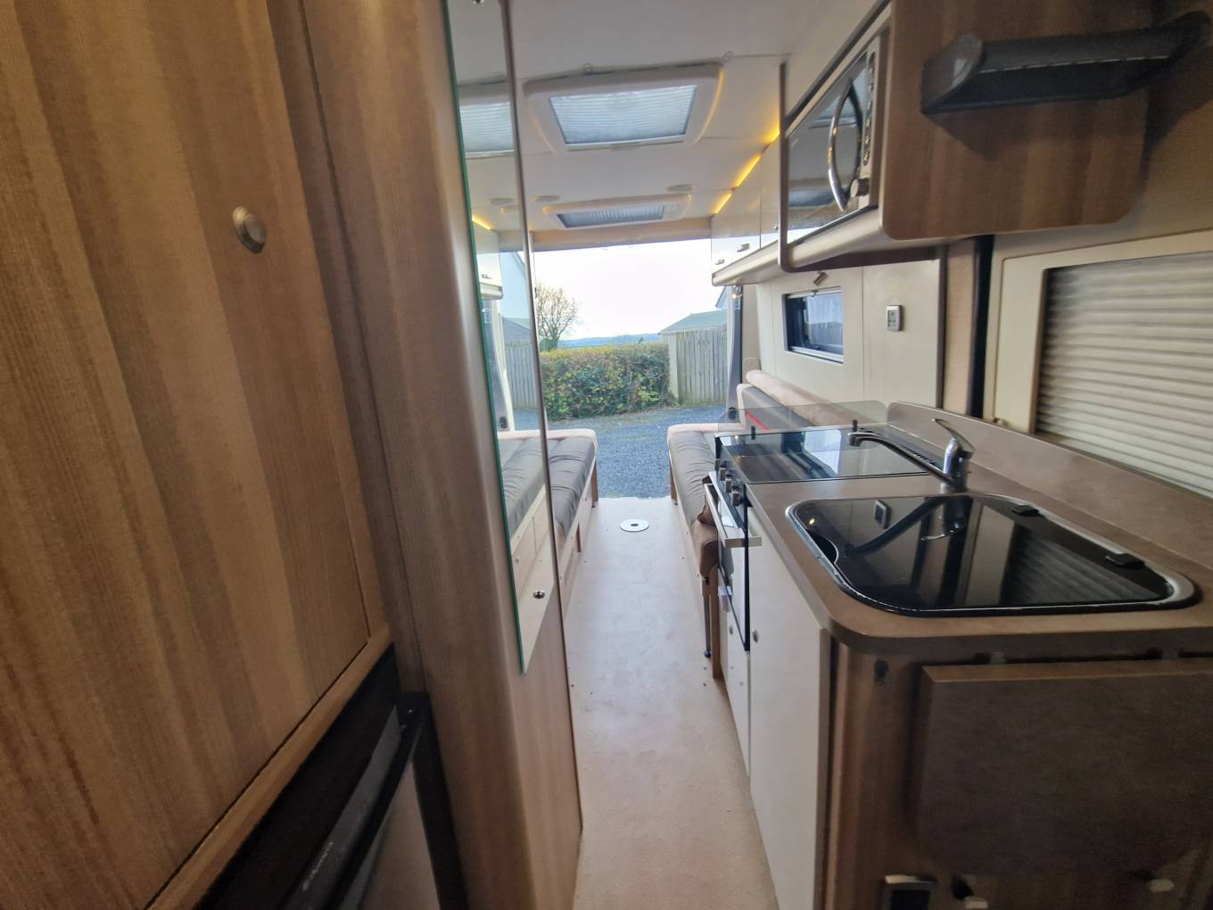 At the rear is the all-important and much sort after lounge with rear opening doors and long, comfortable bench sofas, that face each other, ideal for socialising, stretching out and relaxing or dining. The upholstery is in excellent condition throughout. The seating simply slides out to meet each other in the middle, the back rests drop in as infill cushions and the large double bed is up and ready,1.86m x 1.88m, or the sofas can be used as two singles, 1.88m x 0.65m. Pleated blinds are supplied for all the windows. Moving forward passed the wardrobe space is a well-proportioned well-lit kitchen, which includes a stainless steel sink with mixer tap and glass cover, the Thetford Triplex hob includes three gas burners and below with combination grill and oven, an extendable worktop and microwave. Adjacent is a fridge-freezer and there is plenty of cupboard and overhead locker space.