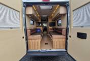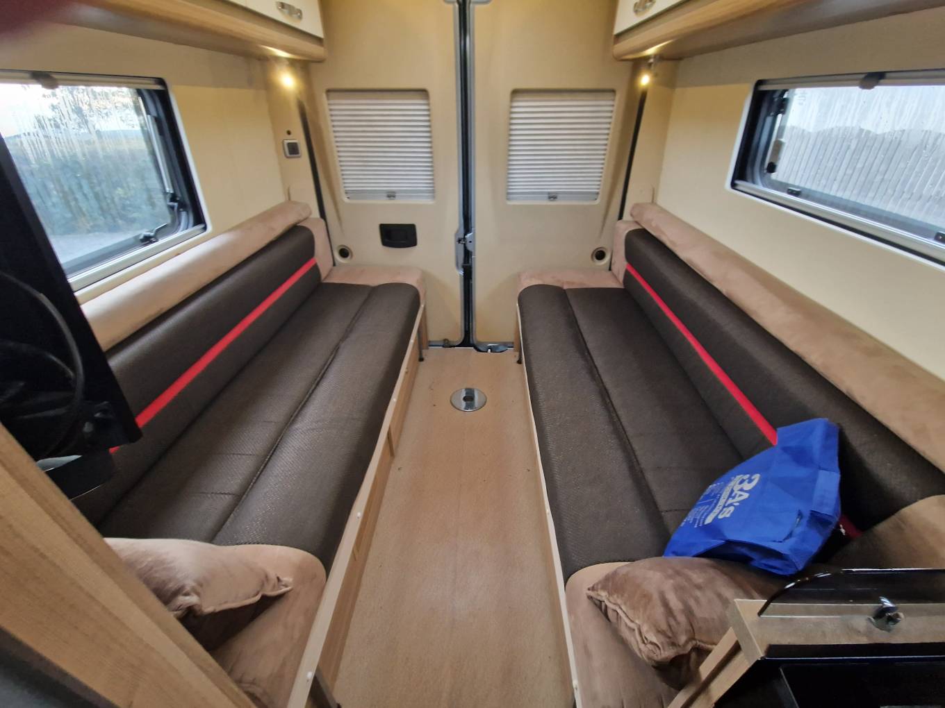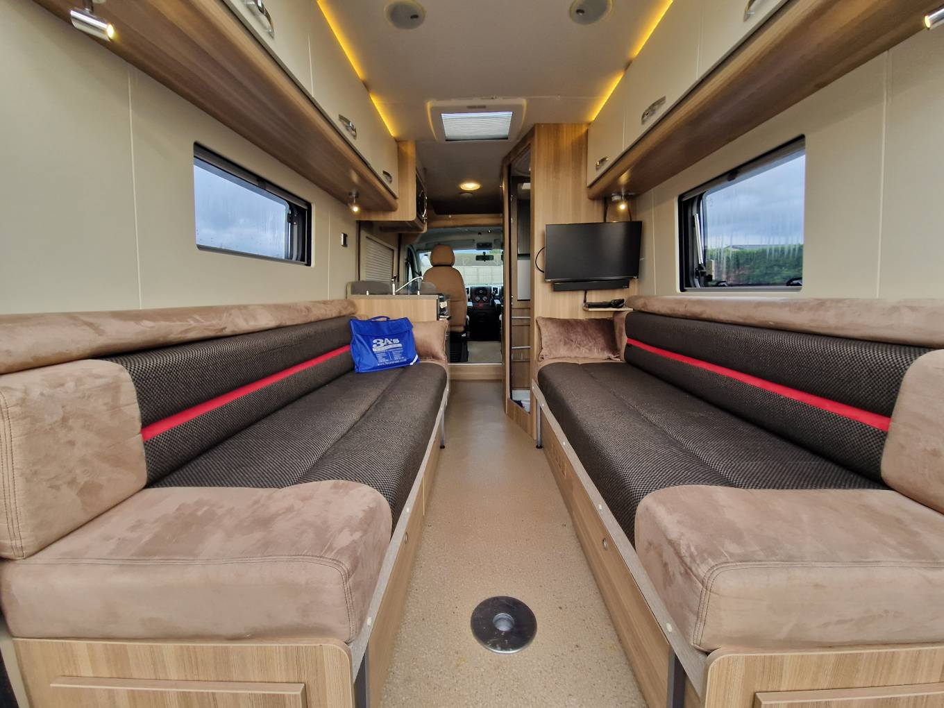 Other specifications include Solar panel, Truma Combi gas or electric blown heating and water heating, two roof skylights, rear radio speakers in living area, television on a drop-down mount, 4 mains sockets, onboard fresh water tank, onboard grey waste water tank, electric mains hook up, gas locker, electric Thule step, Fiamma 65s wind-out awning offering plenty of shade and shelter, external mains socket, towbar, TV aerial and satellite, LED awning light, wheel chocks, hook up cable and full a size spare wheel.