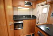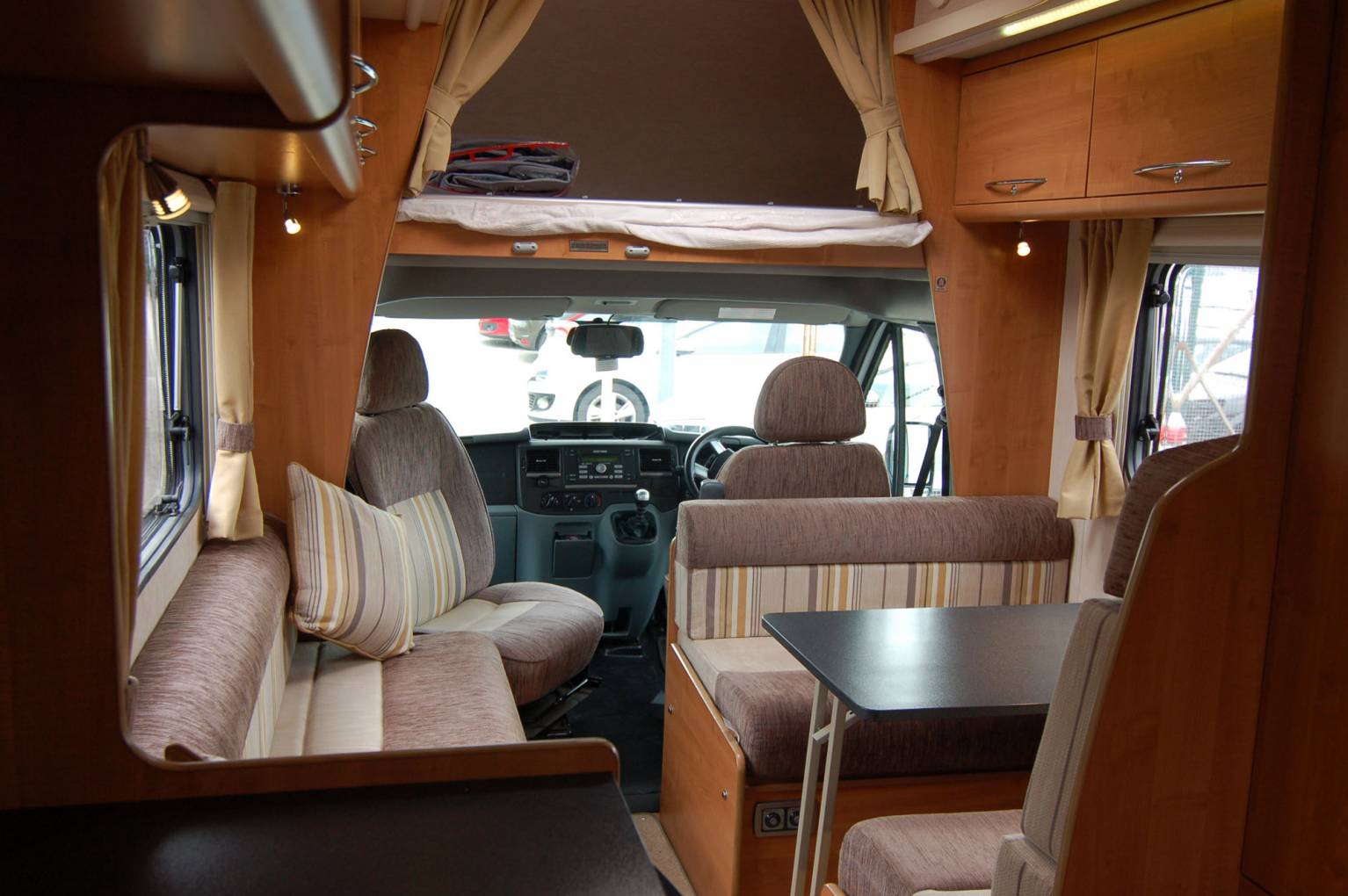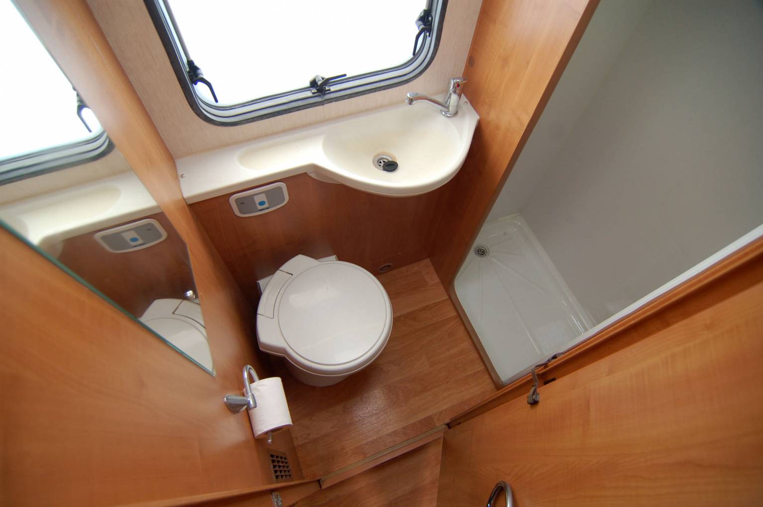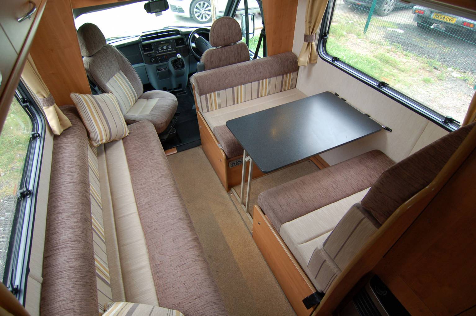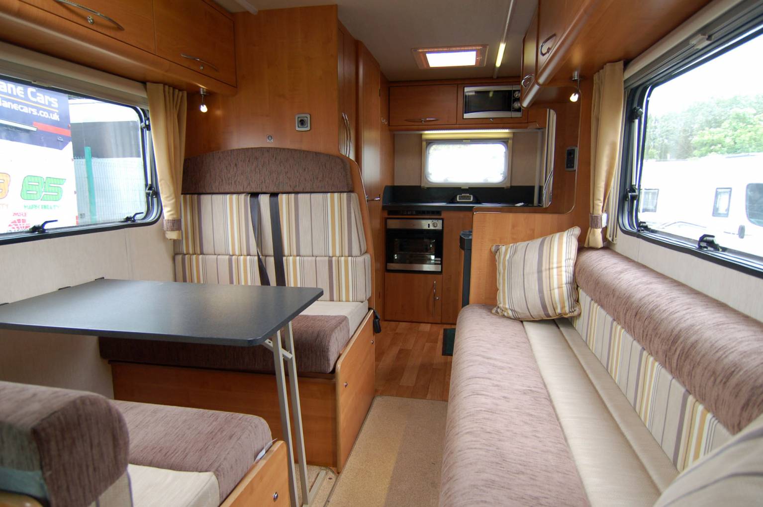 Excellent example of this popular, modern styled motorhome, having all the right equipment, 4 travelling seats and can be driven on a standard car licence. Essentially, the layout comprises of a generous overcab double bed, central seating group with table and side settee, rear washroom including lined shower cubicle, toilet and vanity sink, plus an end kitchen having 80 litre fridge, gas hob, oven and grill, microwave.