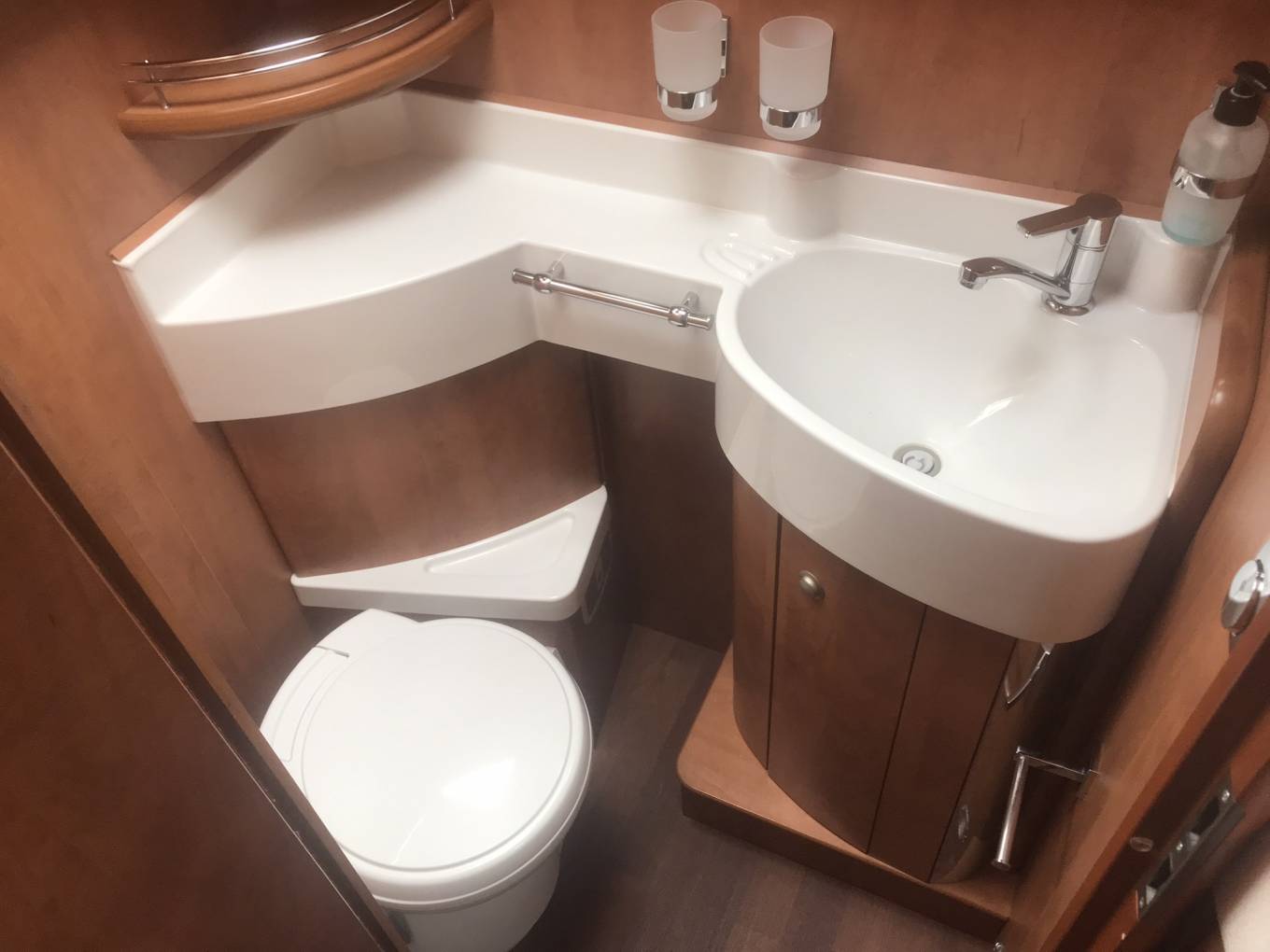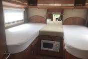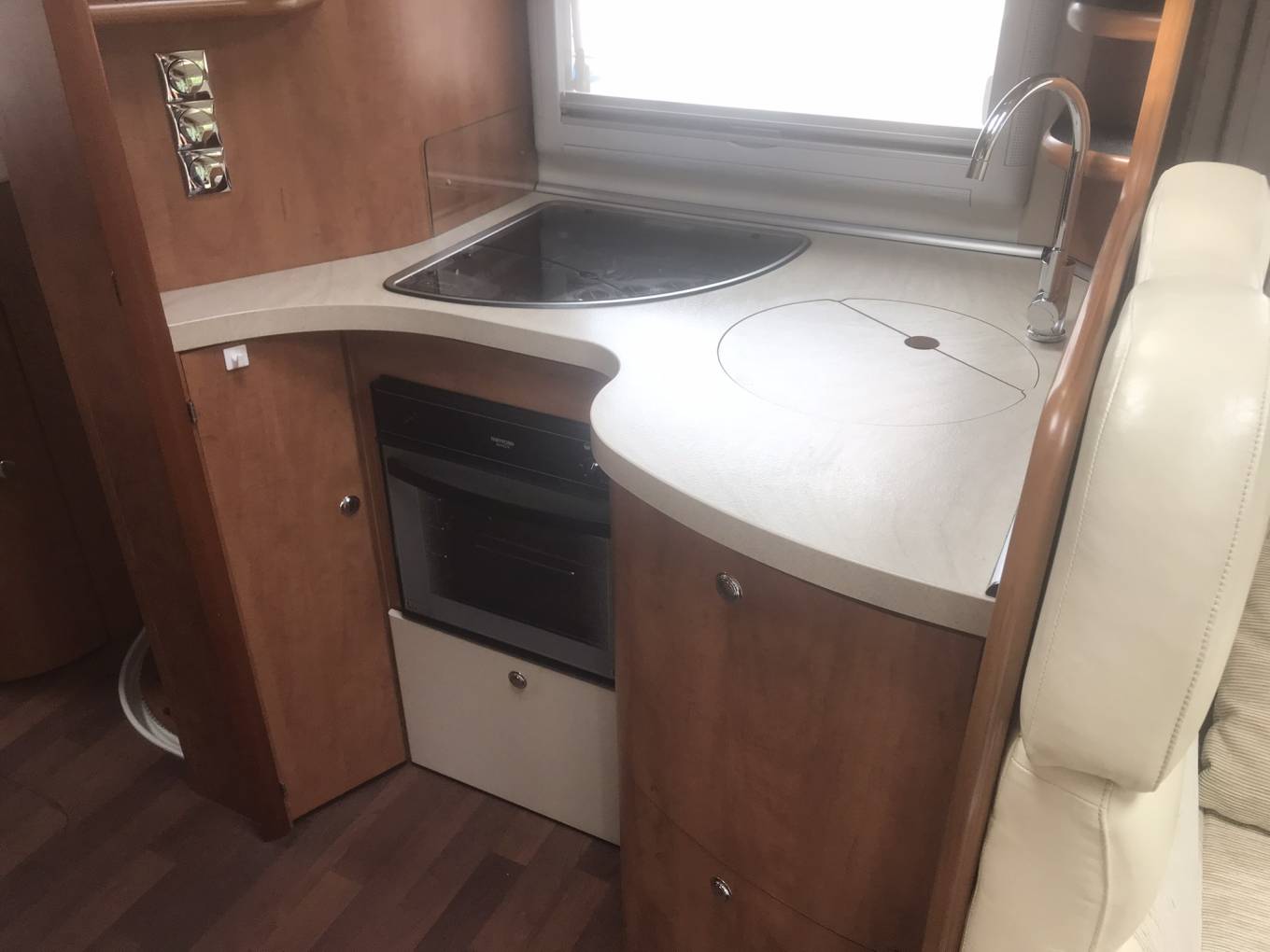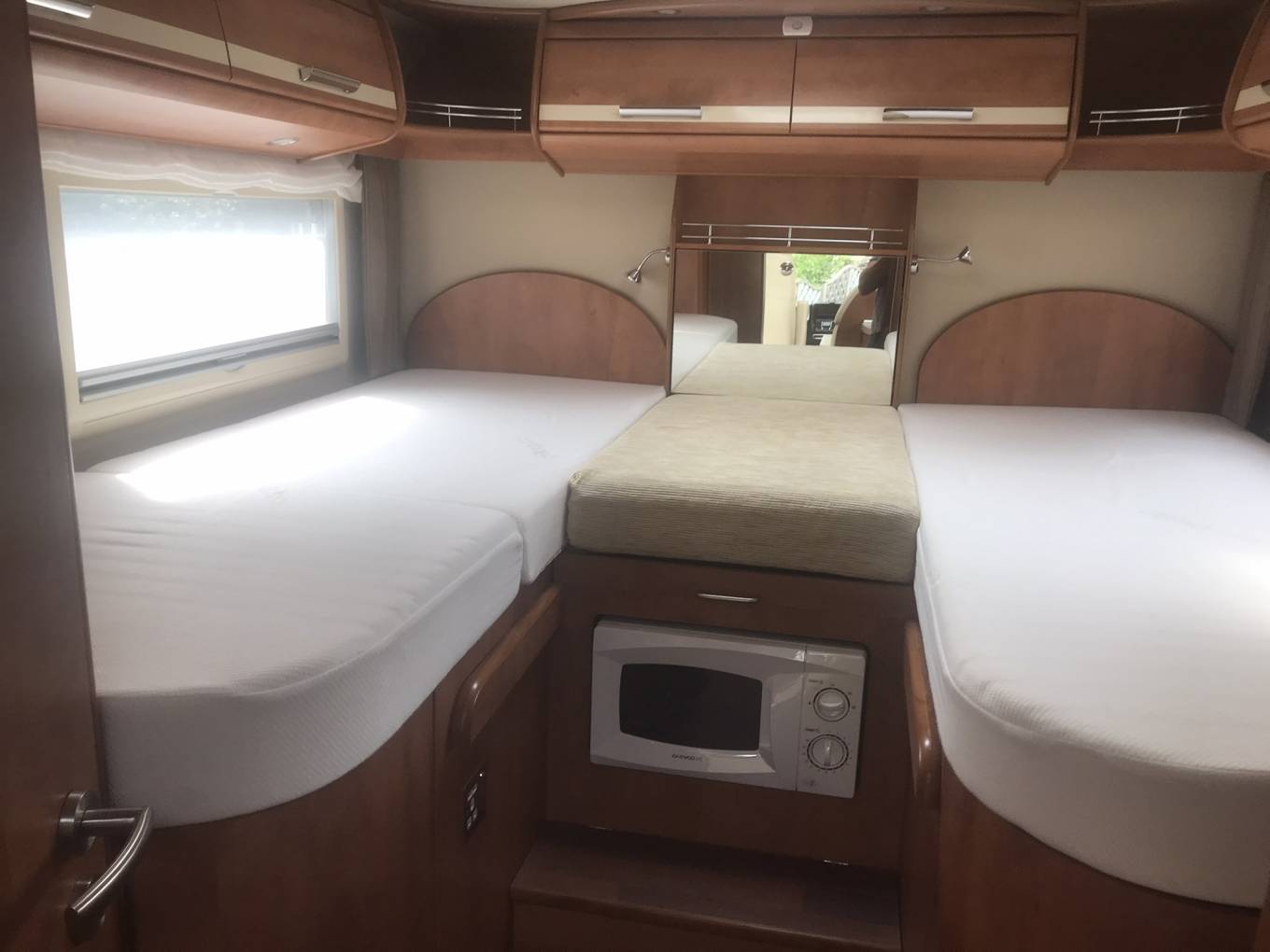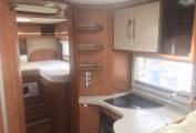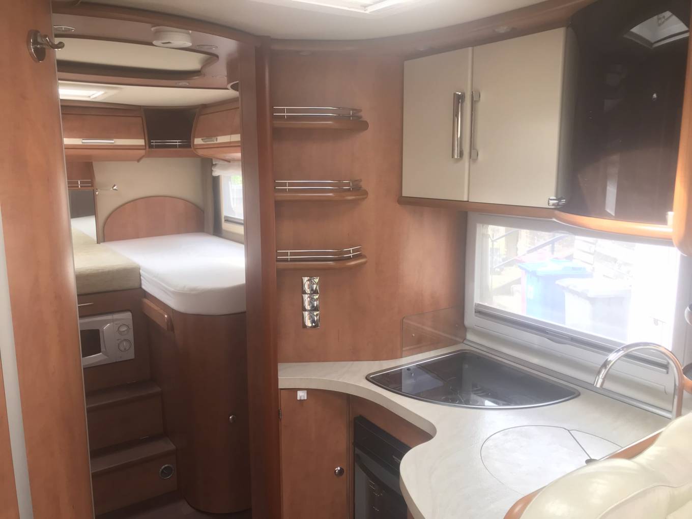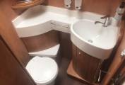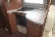 The kitchen is well equipped with a 3-ring gas hob, oven with grill, large fridge and freezer, sink and plenty of storage. There is also a microwave which is cleverly hidden in the step to the rear bed area.