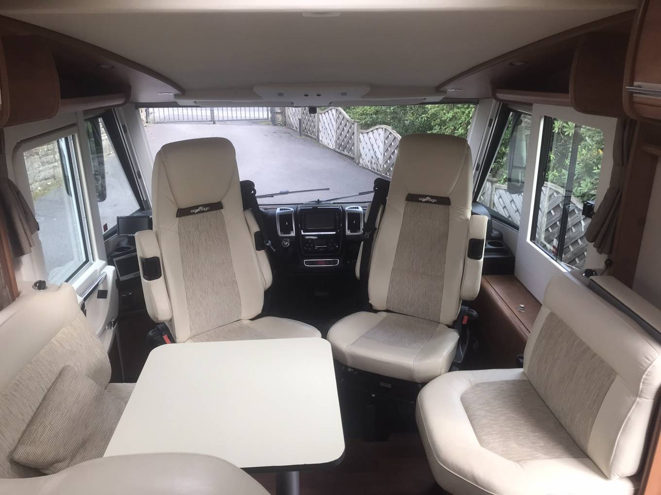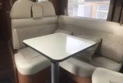 The Cab and habitation seats have had a more recently upgraded leather interior making it feel very fresh(cost £2470). The front, Aguti, cab seats swivel to join the dinette area with a table and plenty of seating.