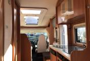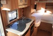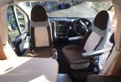 The vehicle has a rear bedroom, complete with two single beds and an adjoining removable cushion. There is plenty of overhead storage and cupboard space.