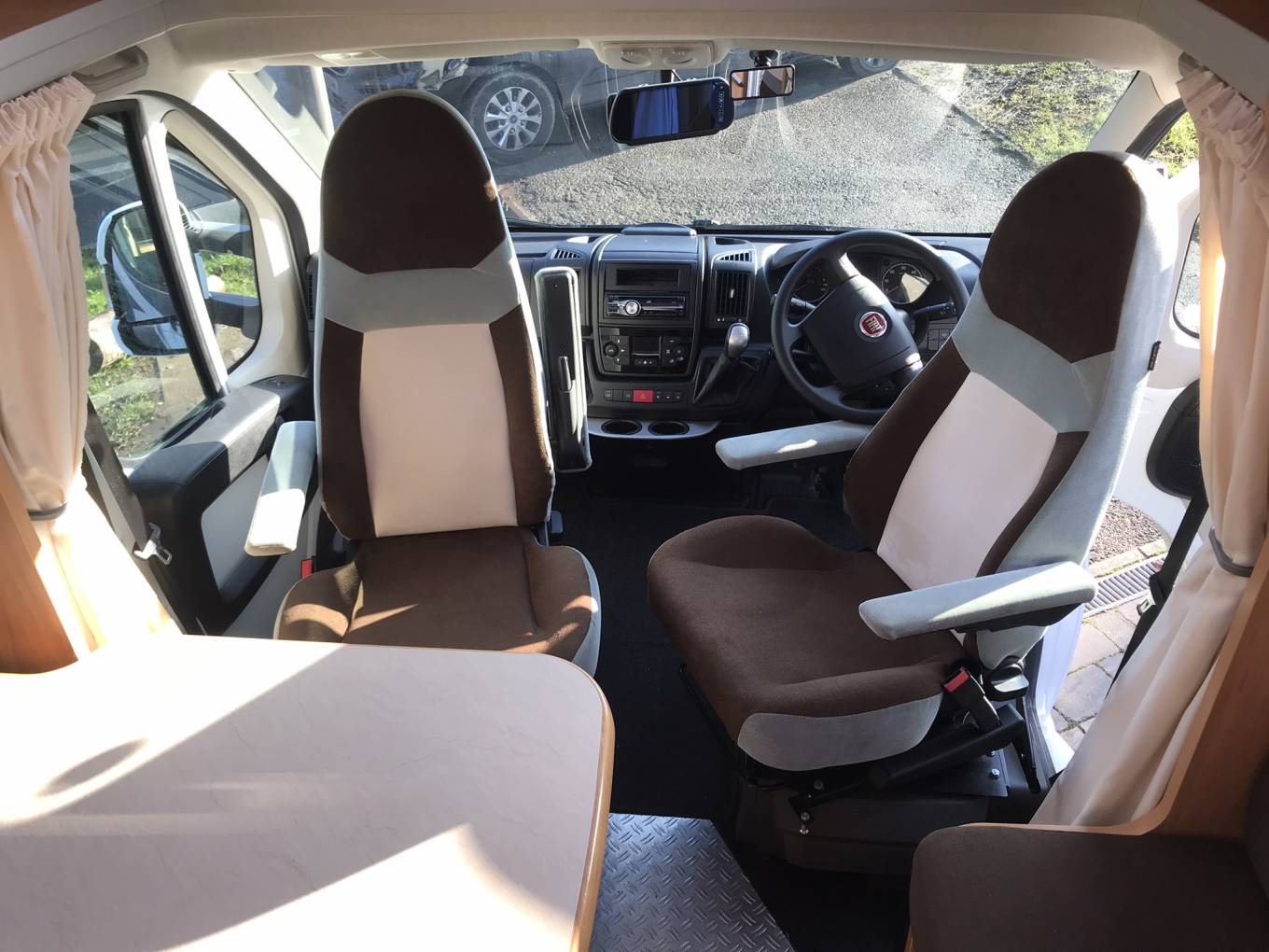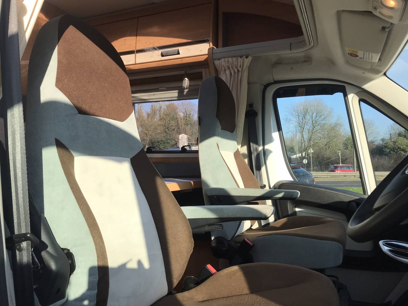 The two seats swivel to meet the dinette area which will seat another 3 or 4 people (2 additional seatbelts).