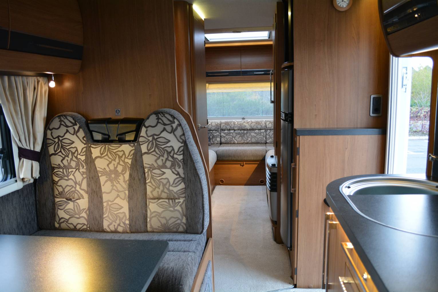 2014 Autotrail Frontier Scout in exceptional condition with excellent specification. Ever Popular layout gives living options for up to six people without compromise. Based on the Fiat Ducato chassis with additional Alko support. Cab specification includes cruise control, electric windows and mirrors, passenger airbag, stereo and Remis blinds. Hi Line model measuring 7.9m in length, 3.1m height and 2.35m wide. Gross weight is 4250kg with a payload of 650kg. Three separate sleeping areas each providing a double bed have always made the Scout the ultimate family motorhome. Washroom with separate shower enclosure and large, generously equipped kitchen complete the package. Features include recessed awning, satellite system, drop down television, solar panel, reverse camera and swivel seats. Full mechanical and habitation service history.