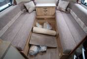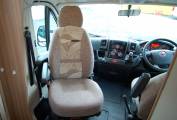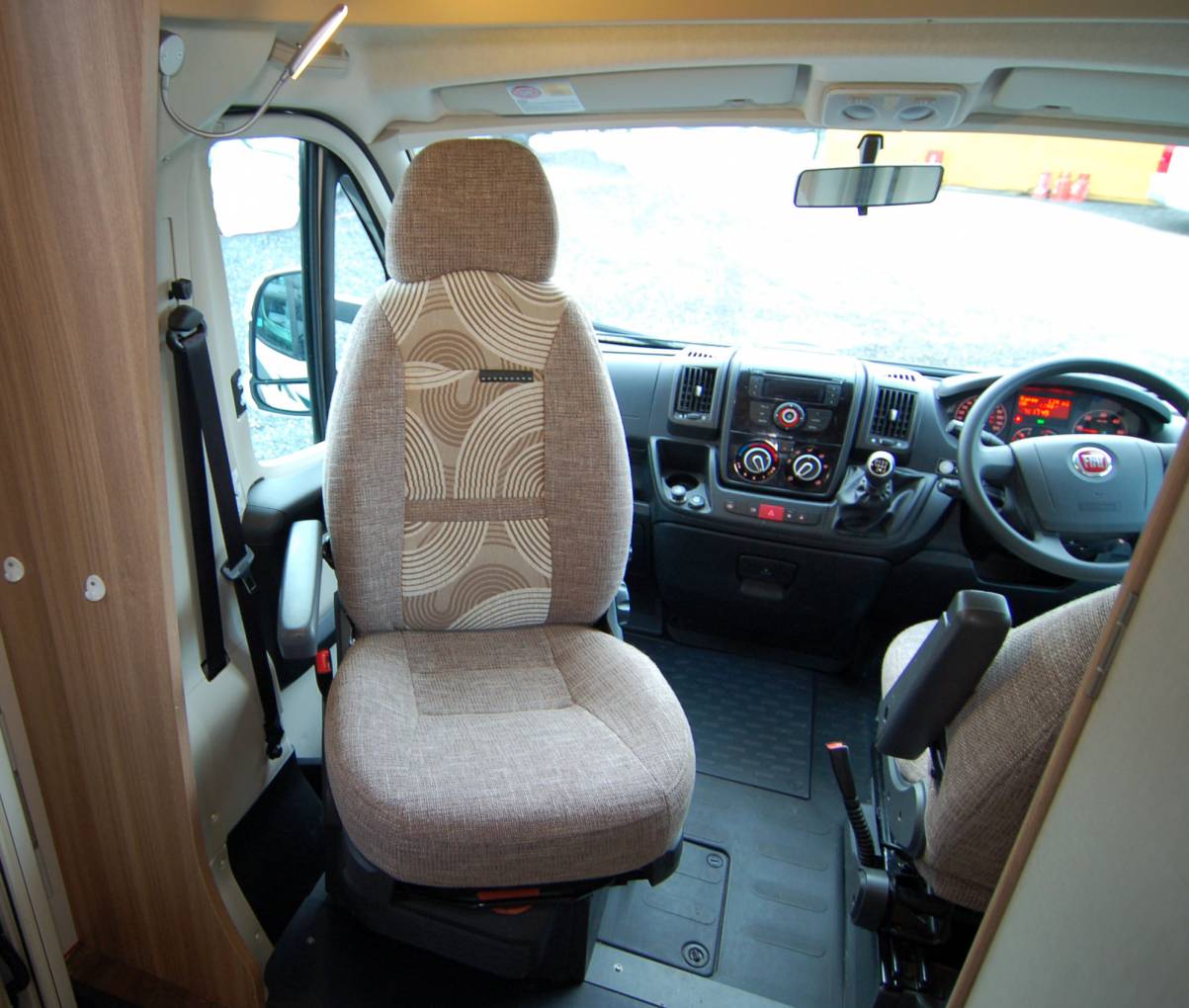 Up front the Fiat Ducato is very easy to drive with light controls yet plenty of power, electric windows and mirrors, cab air conditioning and cruise control. Plated at 3500KG, the Bessacarr can be driven on a standard car licence. The cab area can be quickly screened off at night using the integrated blinds, and the passenger seat swivels to offer extra daytime seating.