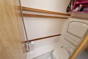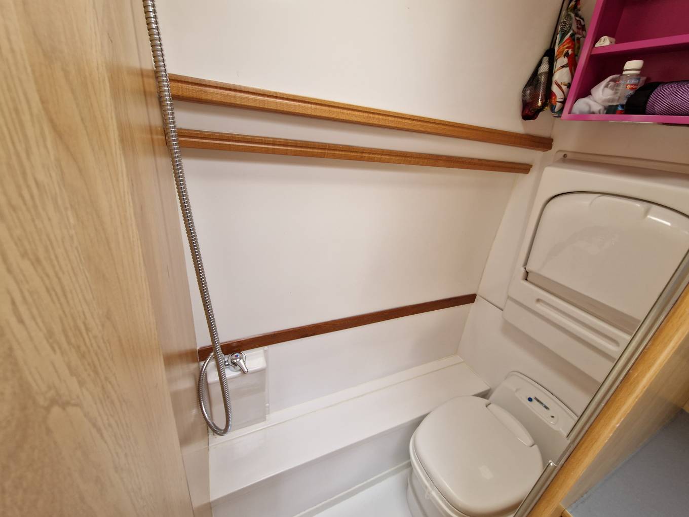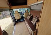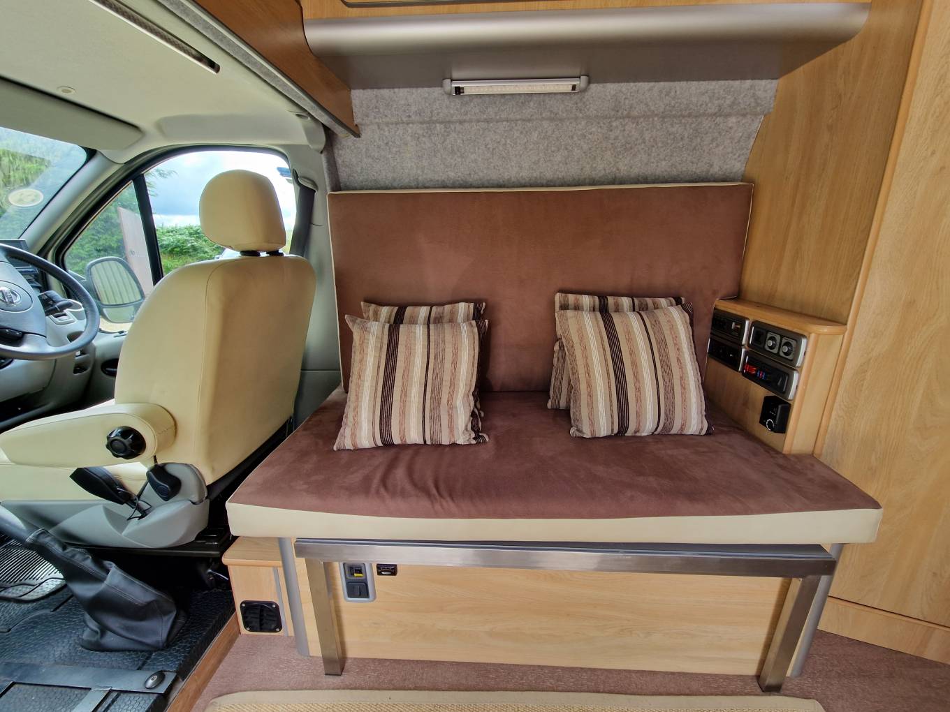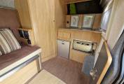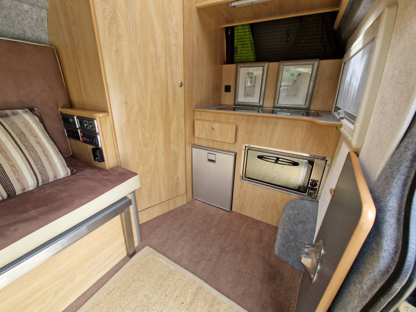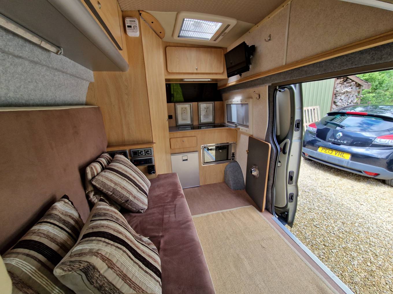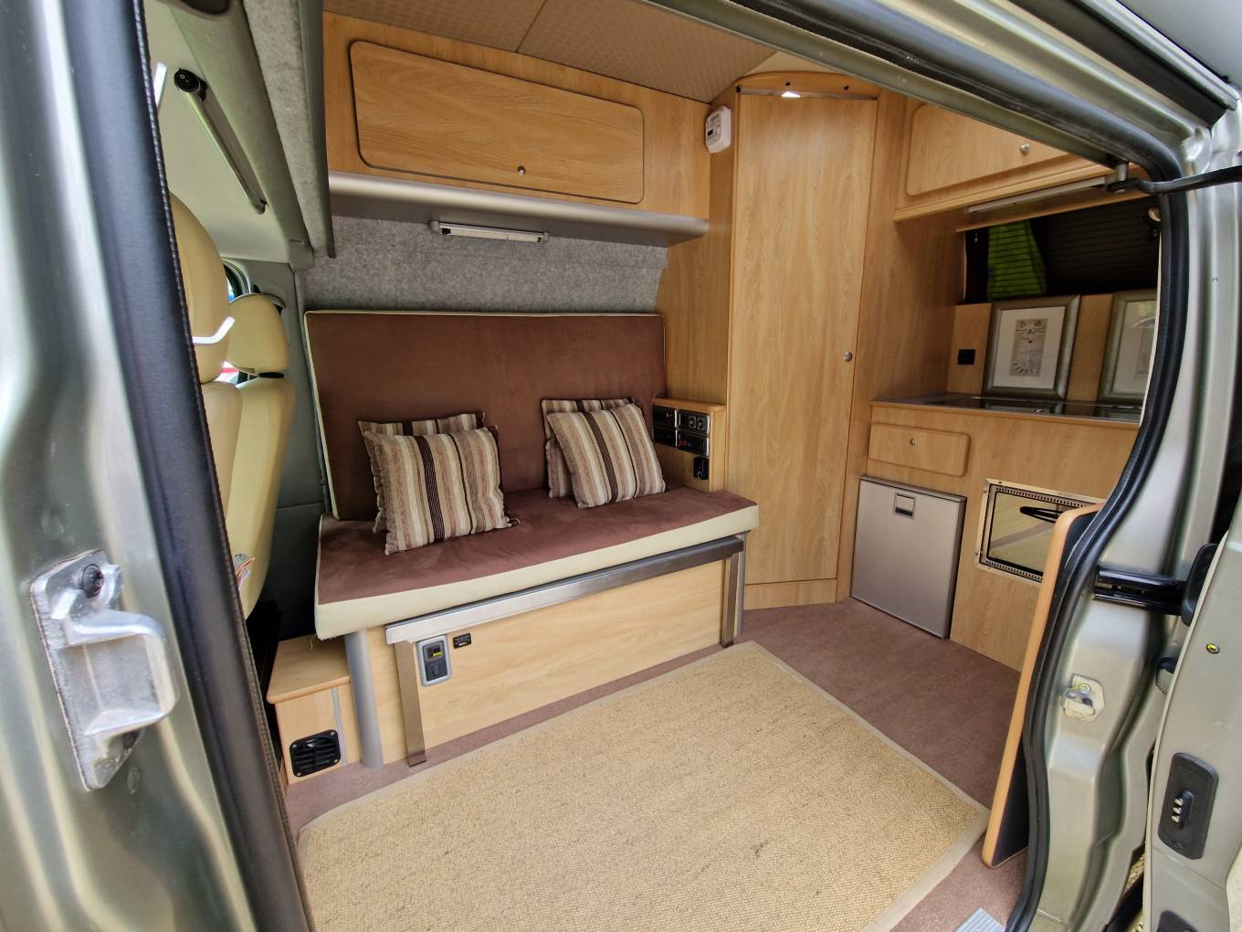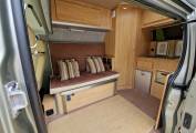 Entering the camper from the side sliding door, there is a sofa directly opposite which converts into a generous double bed and to the right is the toilet and shower room. At the rear is the kitchen with Gas Hob,oven,sink and fridge. Behind the kitchen area there is more storage space which can be accessed from the rear barn doors. The passenger seat swivels providing additional seating to the living area.