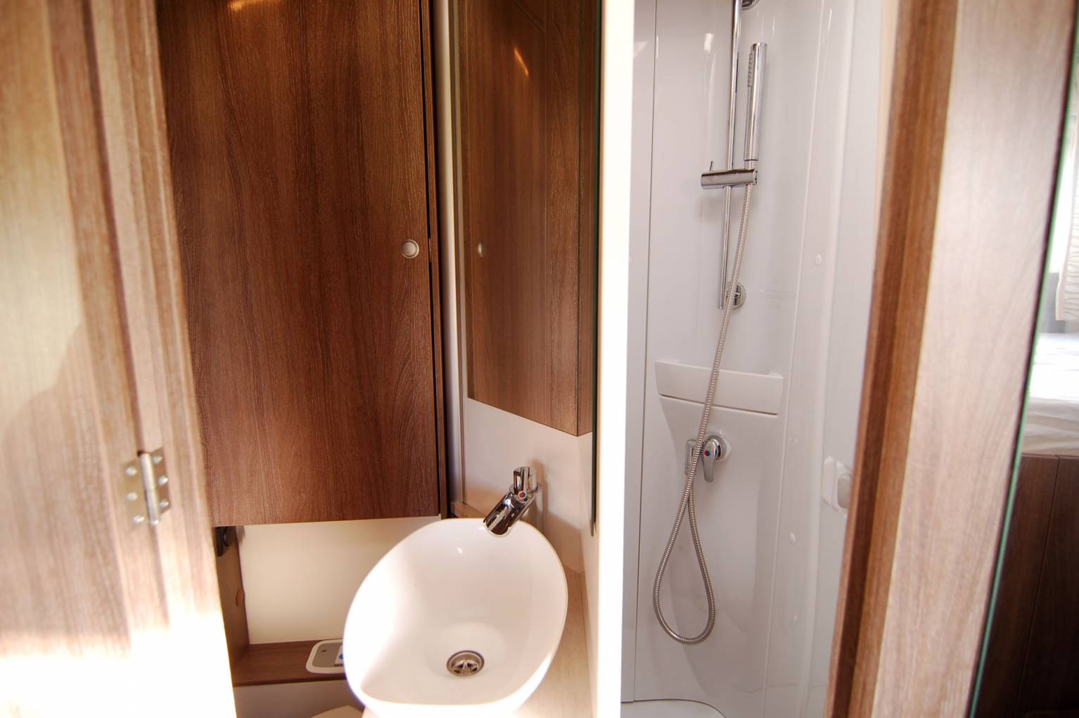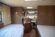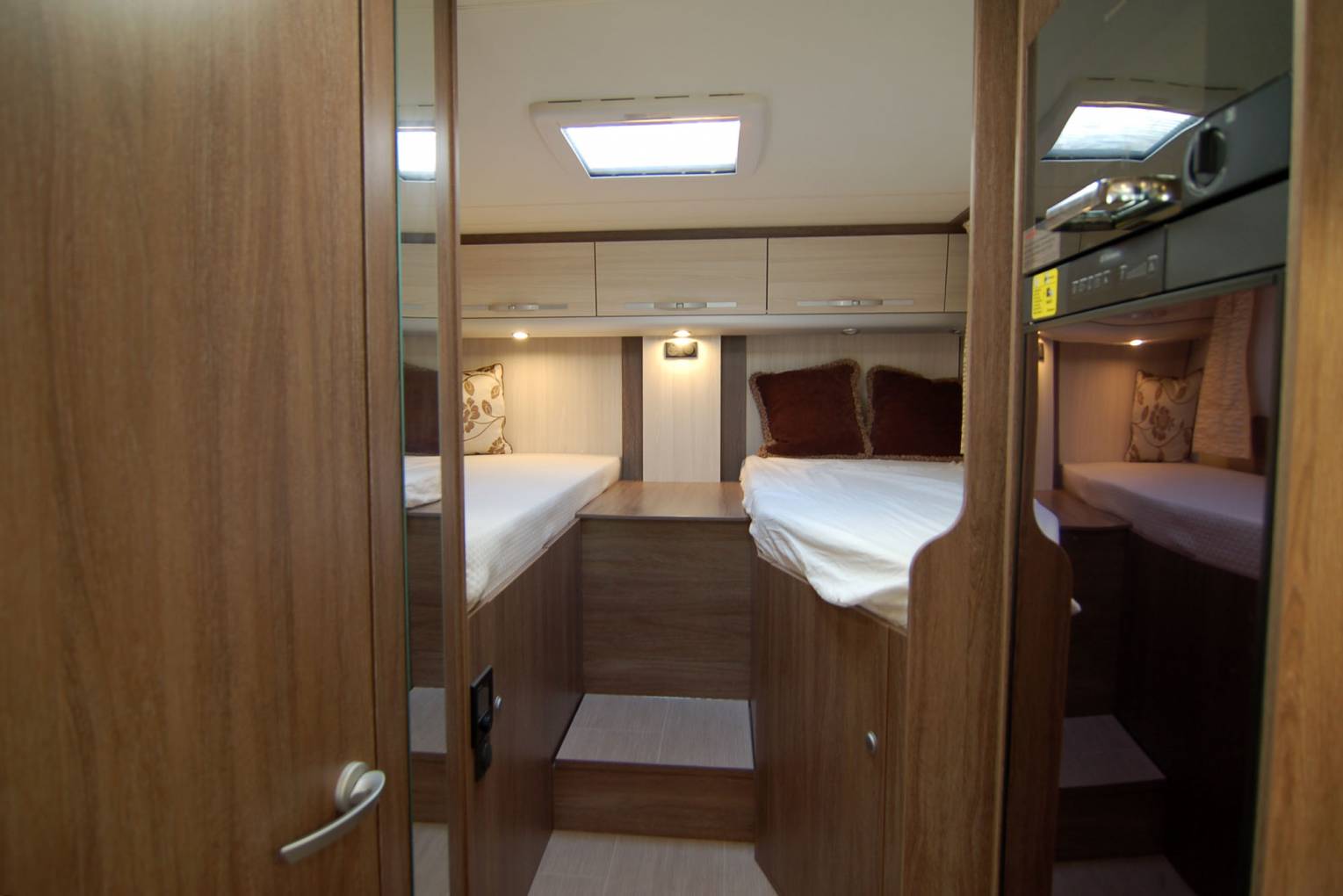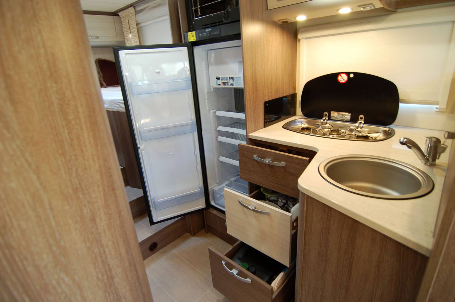 With twin single beds at the rear over a garage and an electrically operated drop down double bed above the dinette, it’s great for two or more as and when required. The rear garage is big enough to keep expensive bikes or hobby kit out of sight with a large access door and there is copious internal storage throughout. The forward dinette can easily seat 5 for a social on the comfortable leather seats, while in the central zone is a well equipped kitchen with all facilities and good cupboard and drawer storage, opposite a cleverly designed washroom with swinging panel which creates a lined shower cubicle.
