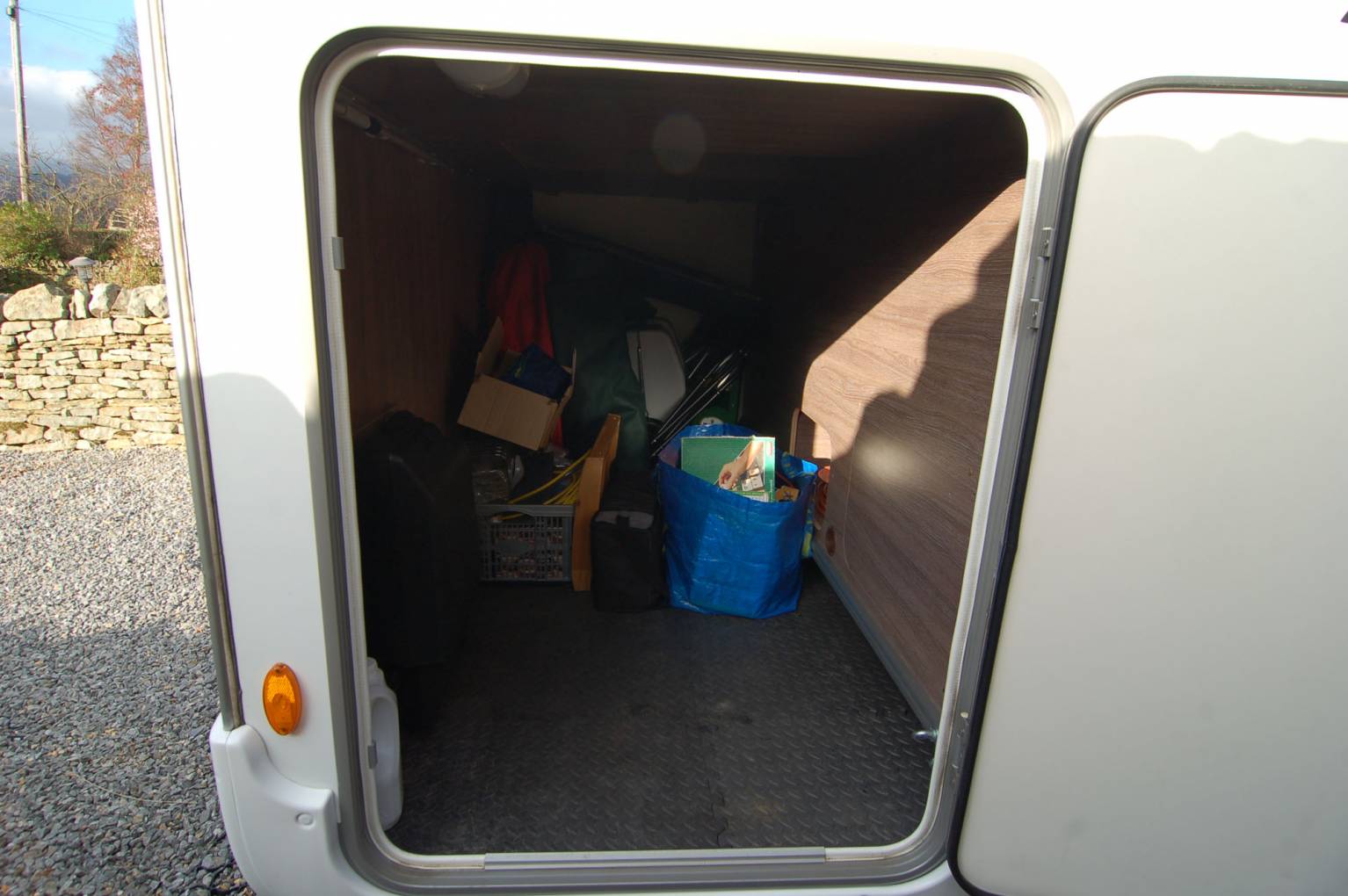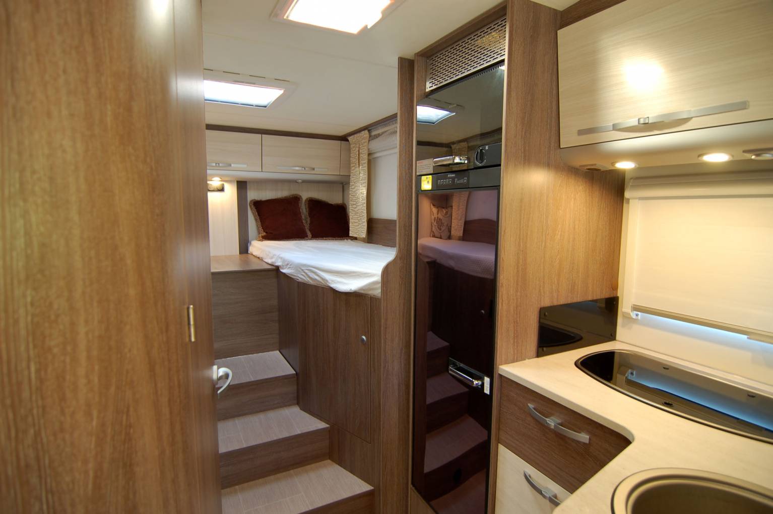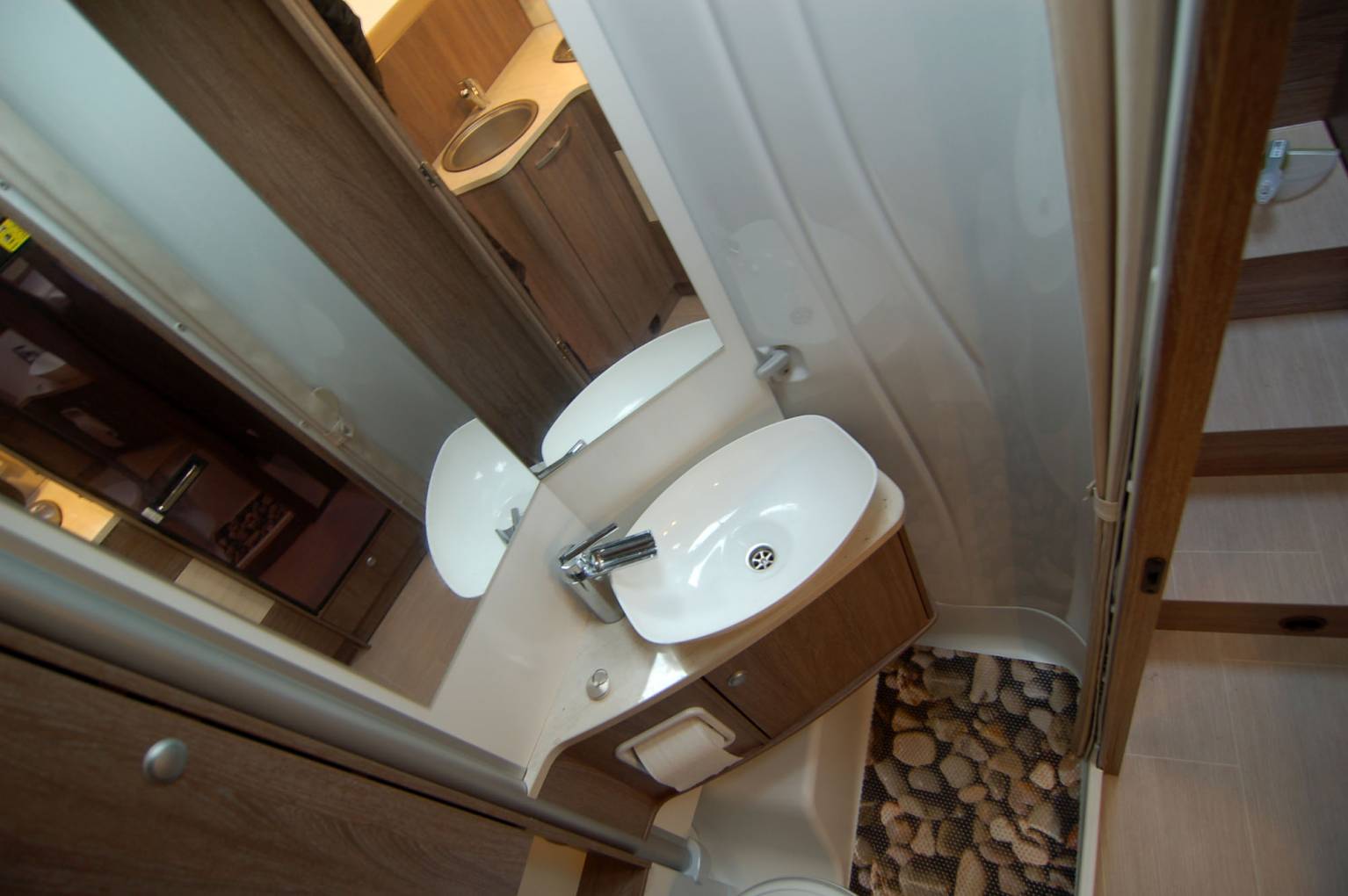With twin single beds at the rear over a garage and an electrically operated drop down double bed above the dinette, it’s great for two or more as and when required. The rear garage is big enough to keep expensive bikes or hobby kit out of sight with a large access door and there is copious internal storage throughout. The forward dinette can easily seat 5 for a social on the comfortable leather seats, while in the central zone is a well equipped kitchen with all facilities and good cupboard and drawer storage, opposite a cleverly designed washroom with swinging panel which creates a lined shower cubicle.