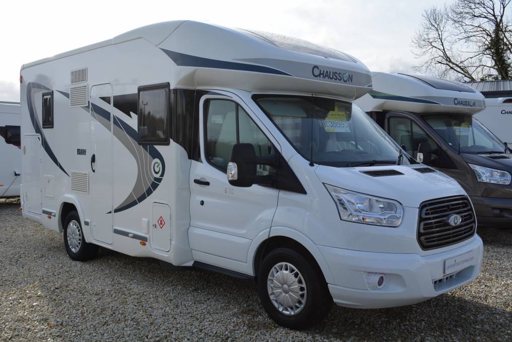 CHAUSSON 610 FLASH 4 BERTH LOW PROFILE MOTORHOME FOR SALE. Presented in fabulous condition with a huge specification list the 610 model is a great all rounder and measures only 6.7m in length with a max weight of 3500kg on a Ford Transit 155hp Motorhome chassis. The specification includes 4 travel seats, 4 berths, drop down bed, maxi washroom with separate shower, maxi lounge area with twin swivel chairs, LED lighting, on the road heating, on board water tanks, hot water, large fridge freezer hob and grill, maxi garage area with triple door access, Chausson VIP pack with air conditioning, cruise control, reverse camera, TV, colour coded cab, sky view sunroof, ext BBQ point and a bike rack. Recent habitation inspection completed incl gas certificate. Sale includes mechanical inspection and 1 years warranty. FINANCE AND PART EXCHANGE AVAILABLE. PLEASE CALL FOR FURTHER DETAILS.