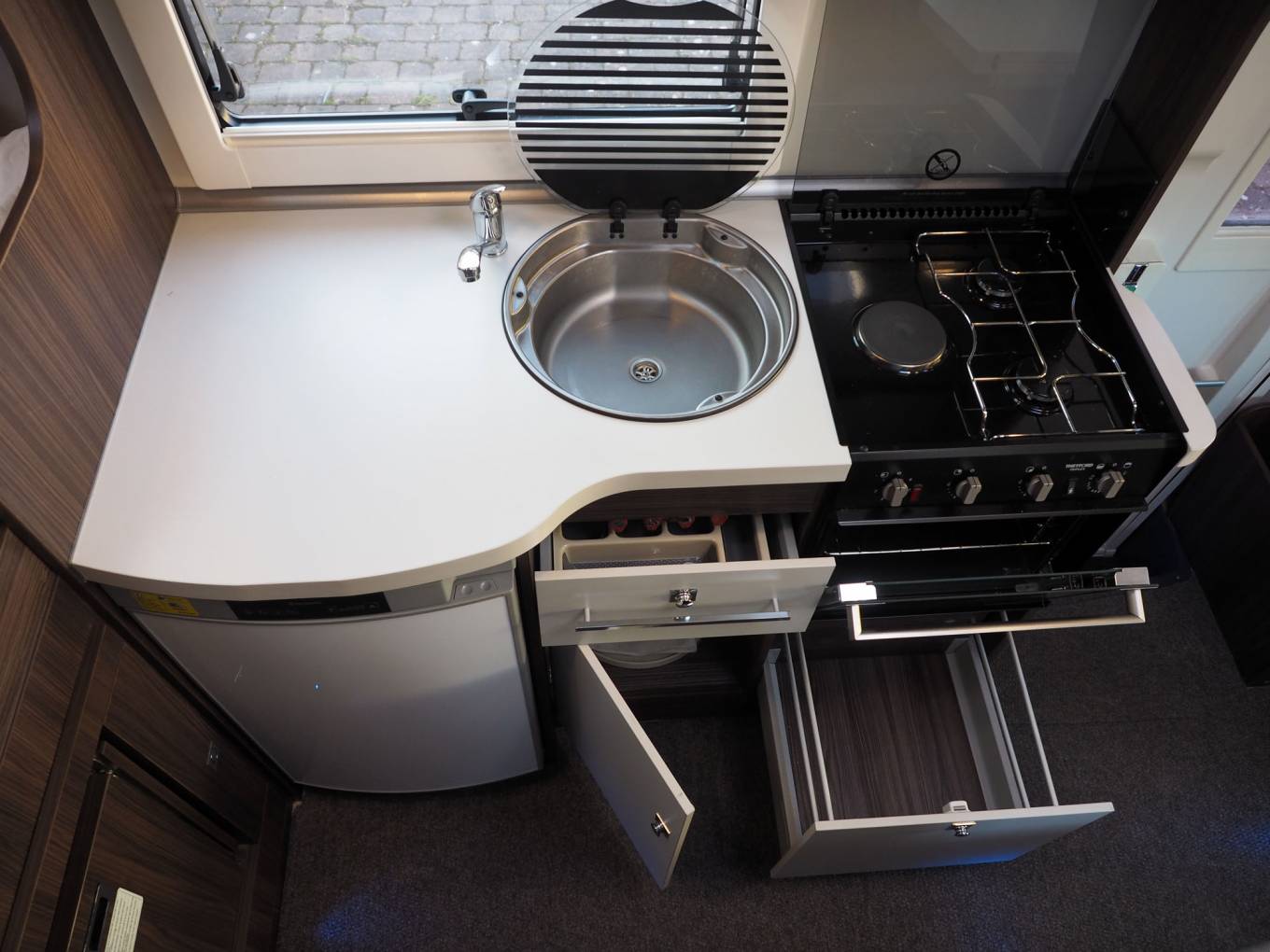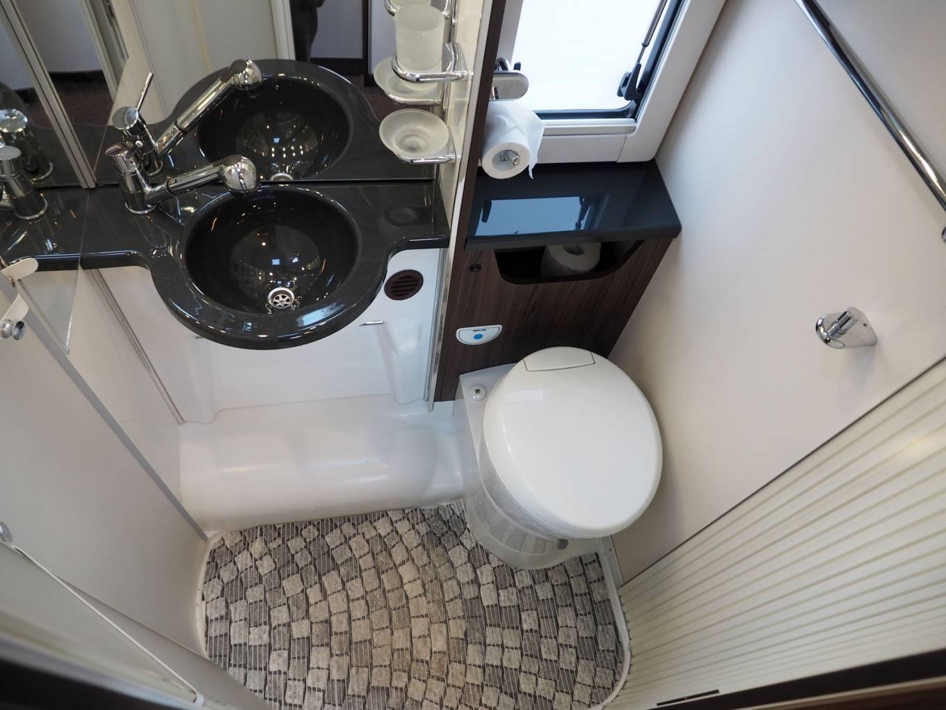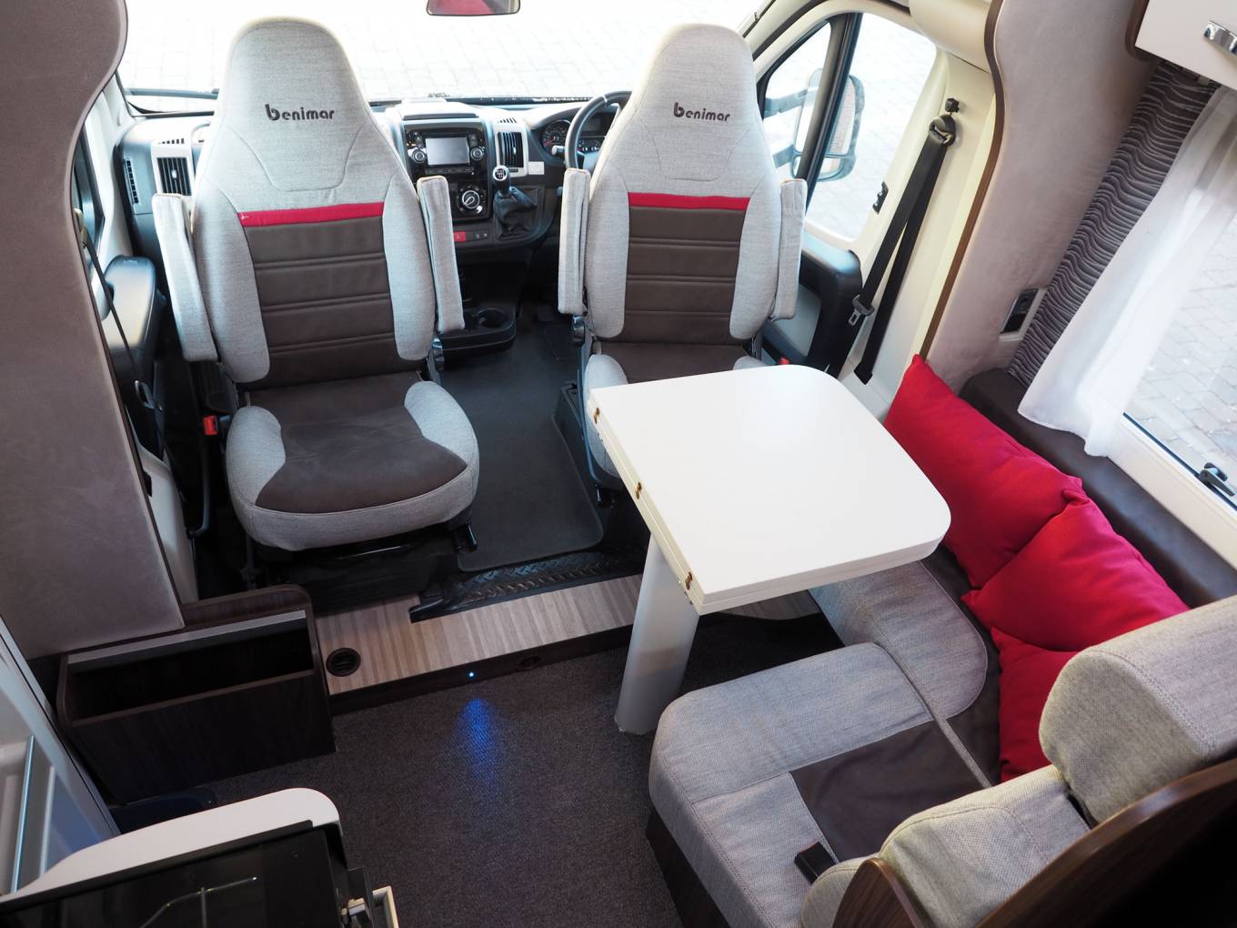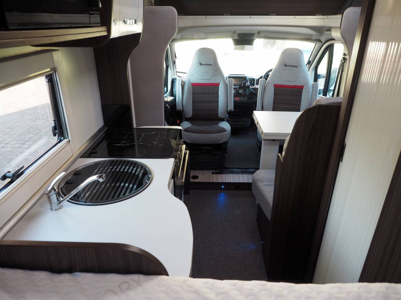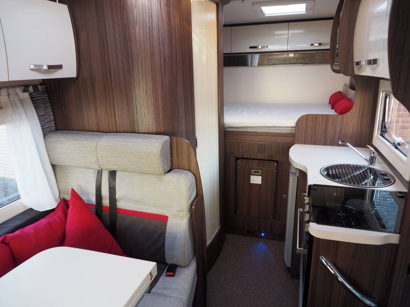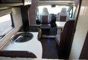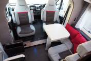 Inside, you will find no space wasted, with both cab seats swivelling into the dinette area around a dual size, multi position pedastal table, in front of a comprehensive kitchen with dual fuel hob, gas oven and grill, fridge and microwave. Opposite the kitchen is the washroom with solid screen shower, toilet and vanity sink, while at the rear is a transverse, height adjustable double bed over the garage, with integrated double step. To the front is a generous overcab bed with window, ventilation and lighting, USB point. Throughout the motorhome, there is a high standard of fixtures and fittings, with a modern styling and ambience.