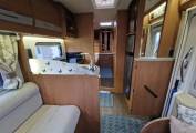 The spacious lounge towards the front with Remis blinds to the cab windows, Swivel captains seats and two opposing side sofas. Comes with a small fully adjustable coffee table plus an Avtex Space saving drop down TV.