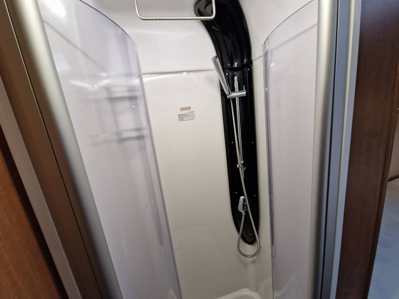 The Savannah features twin single beds at the rear with adjustable backrests on the beds which can be made into a huge double and a central wardrobe with drawers underneath. There’s a separate Toilet with washbasin and large backlit vanity Mirror with a fully enclosed shower cubicle just opposite. The washroom door also acts a door to close off the living area to provide a private en-suite bedroom.