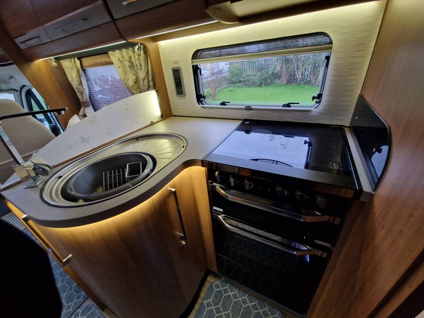 Many features including: Solar Panel, Strike back Alarm, Media Pack with Radio, Bluetooth, Sat Nav, reverse camera, Day time running lights, External BBQ point, Shower Point and 230v Socket outlet. Improved garage protection lining fitted from new , twin leisure batteries coupled with the solar panel gives an excellent off-grid capability. This is the Lo-Line Model which gives additional overhead storage above the cab with large panoramic window.