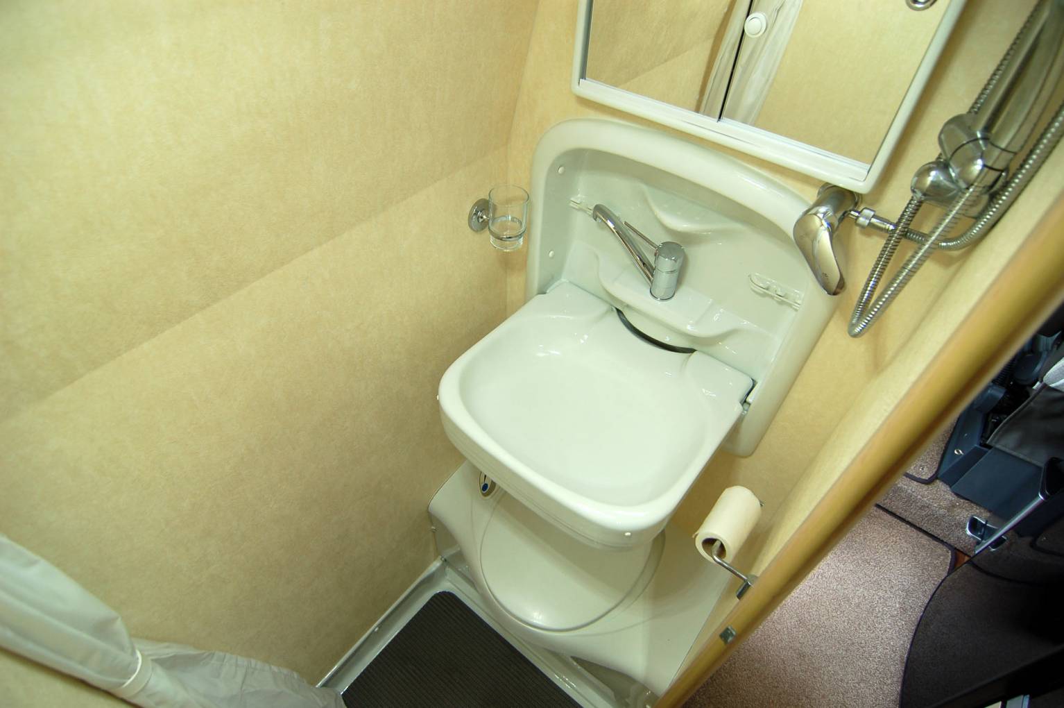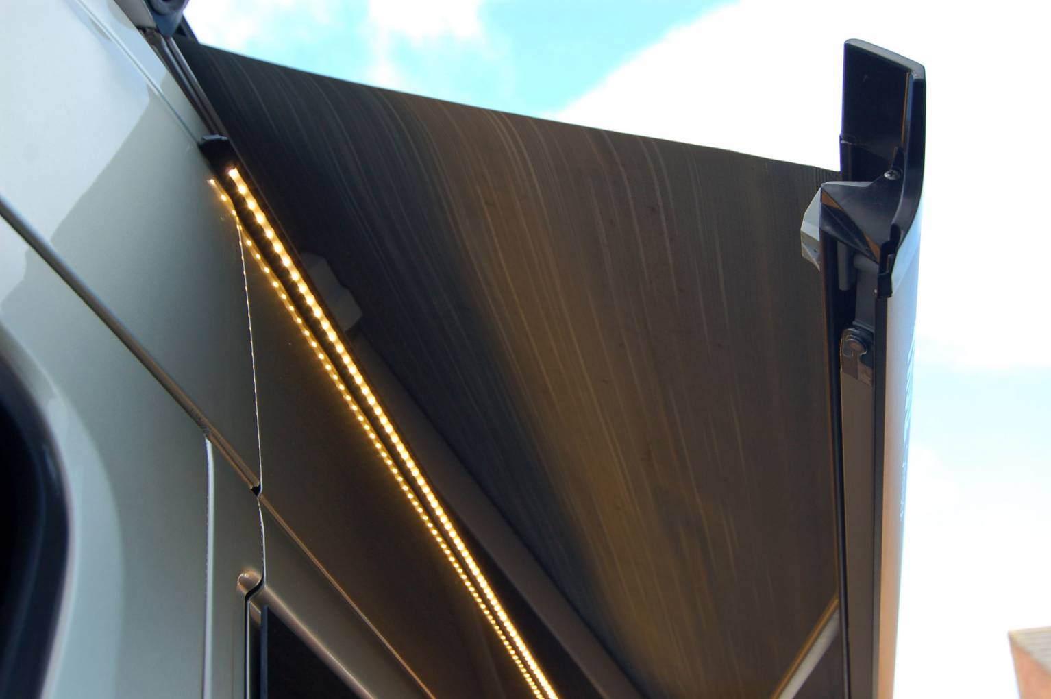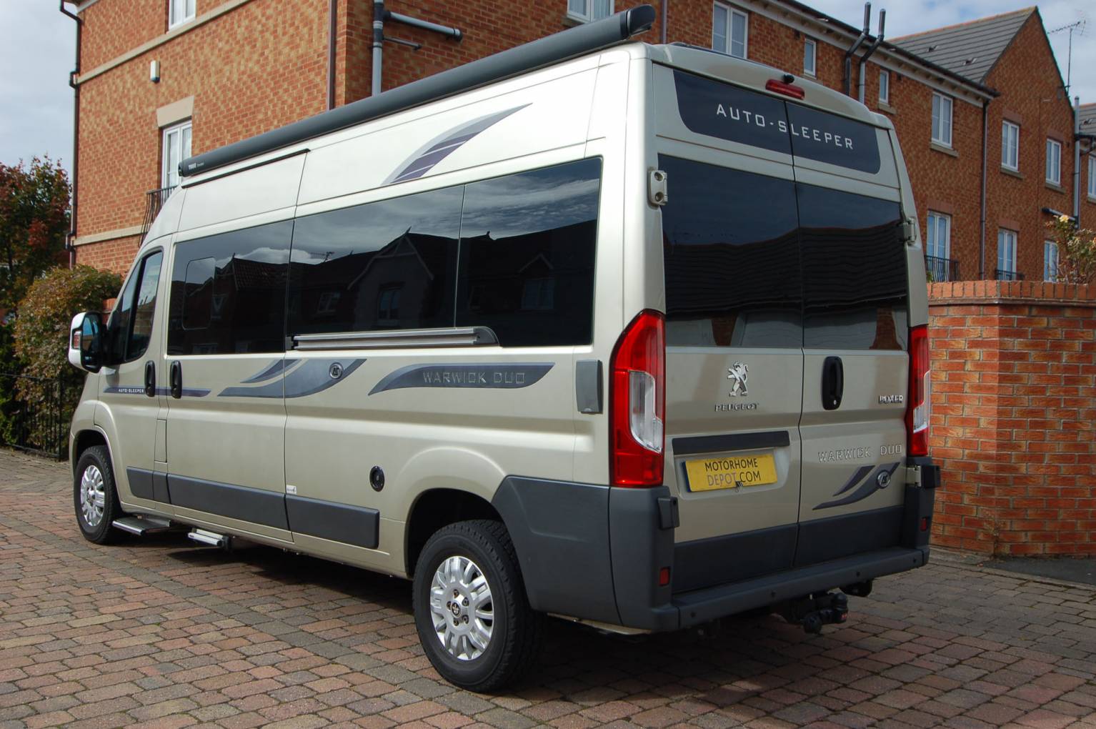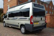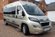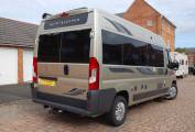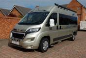 Outside, the Warwick is attractive in gold metallic with window tints and has extra features over standard such as towbar, awning, cab entrance steps and a roof mounted solar panel.