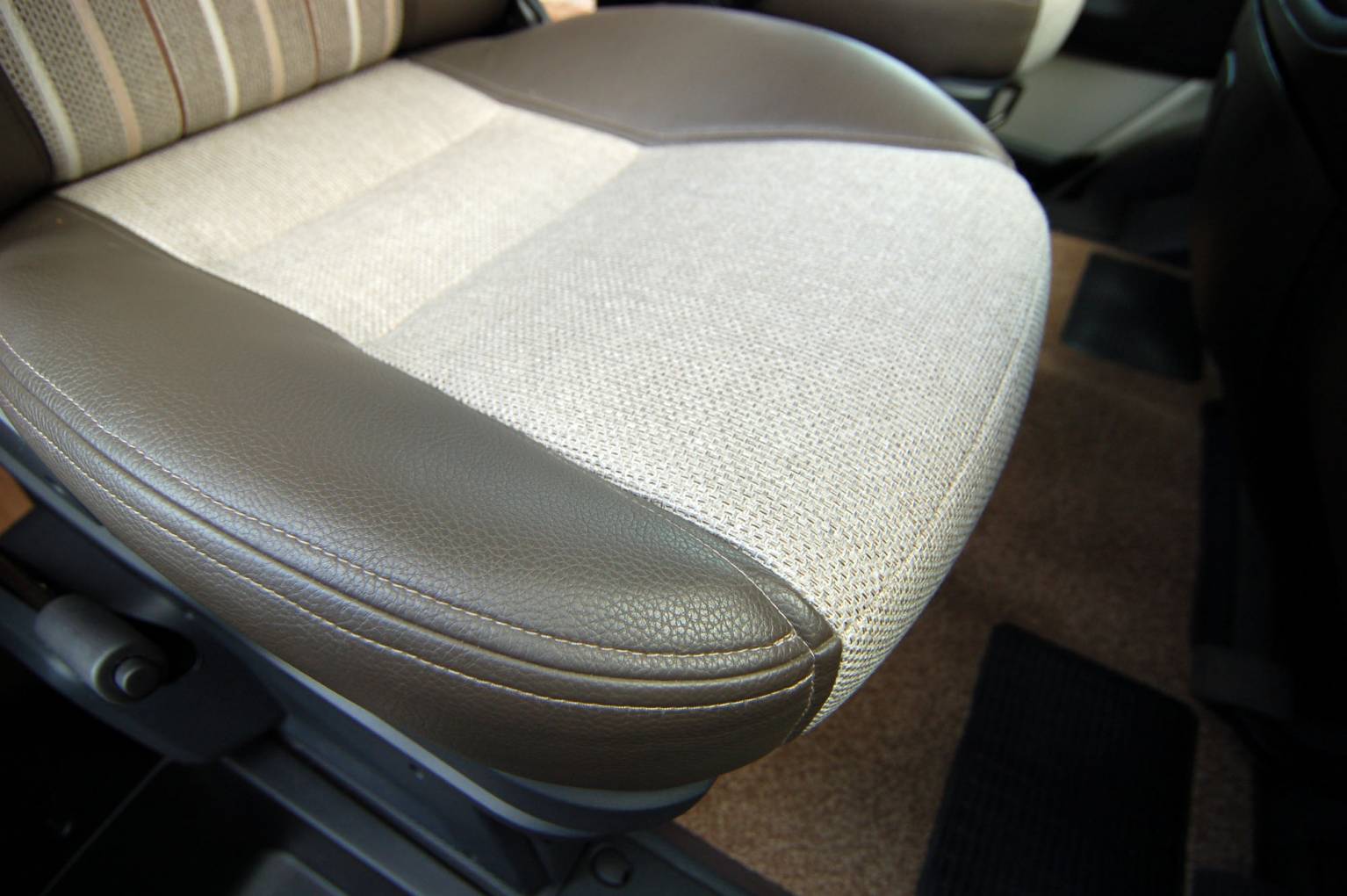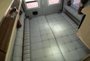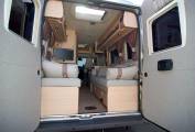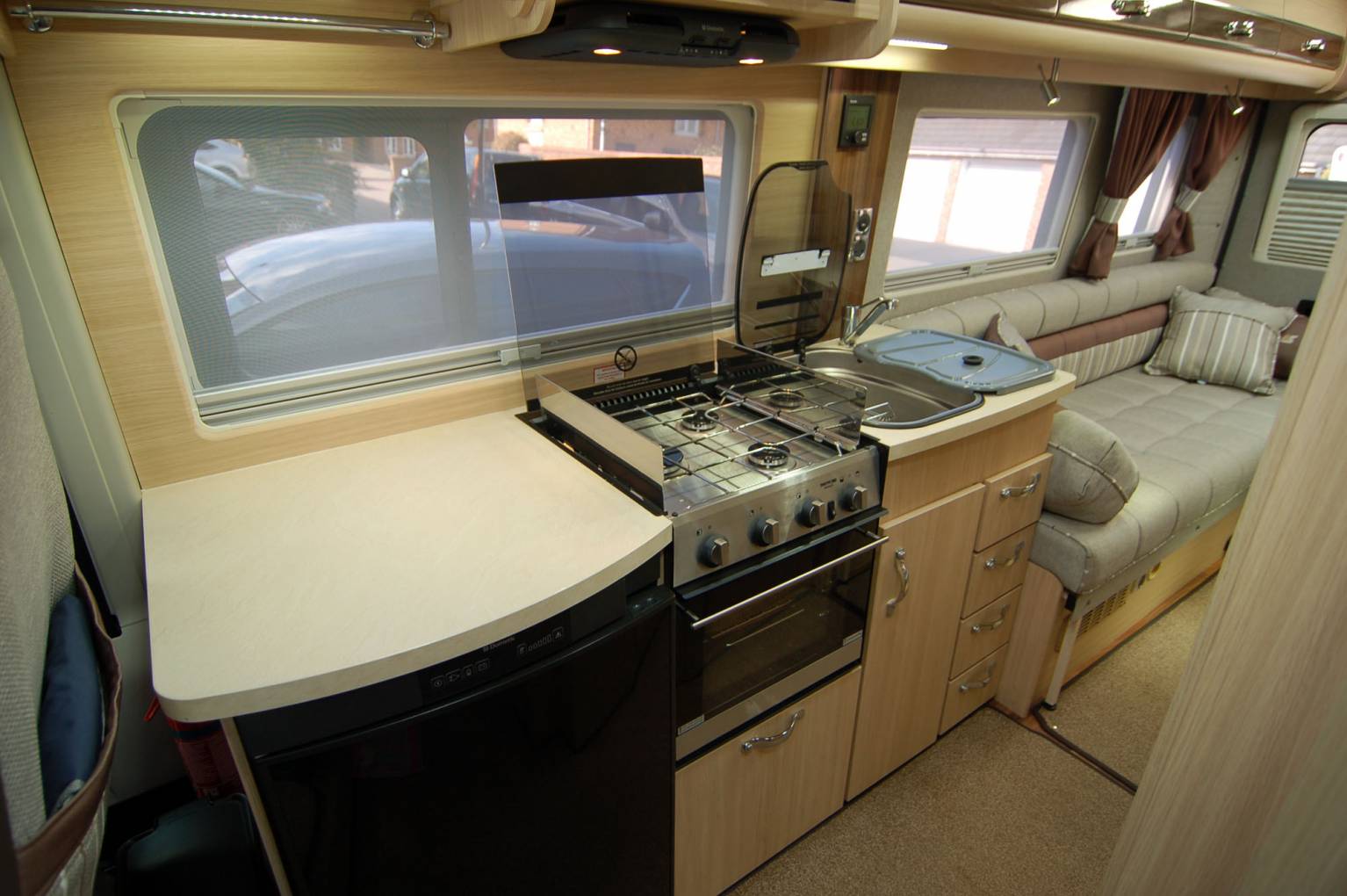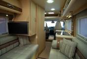 In the midships there is a surprisingly large kitchen with all facilities including extractor, microwave and a variety of storage. Opposite this is a combined washroom with toilet, vanity sink and shower. Domestic gas supply is via a 25 litre factory fitted gas tank, with heating and hot water provided by a powerful dual fuel Truma Combi boiler. Up front the cab is well equipped with light controls, 6 speed gearbox and cruise control. For manoeuvres, there is both a reversing camera and rear bumper sensors. Based on the Peugeot Boxer chassis with 150bhp 2.2 HDi engine, its an effortless drive too.