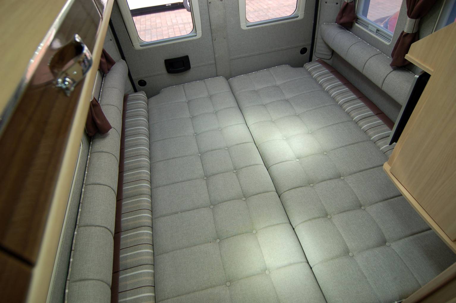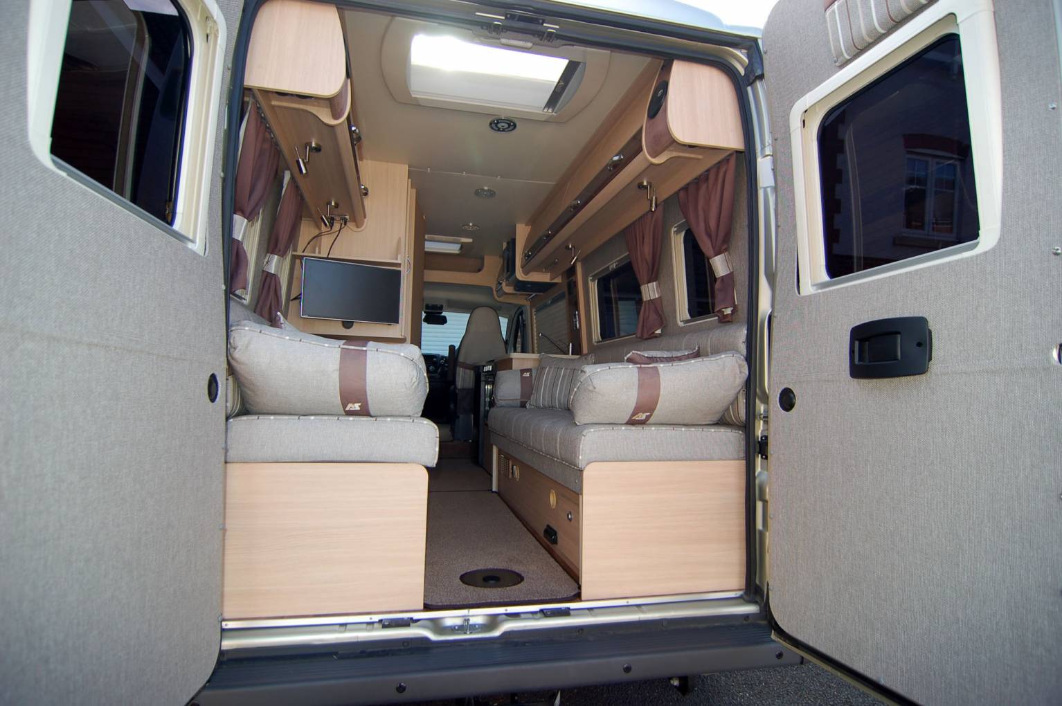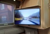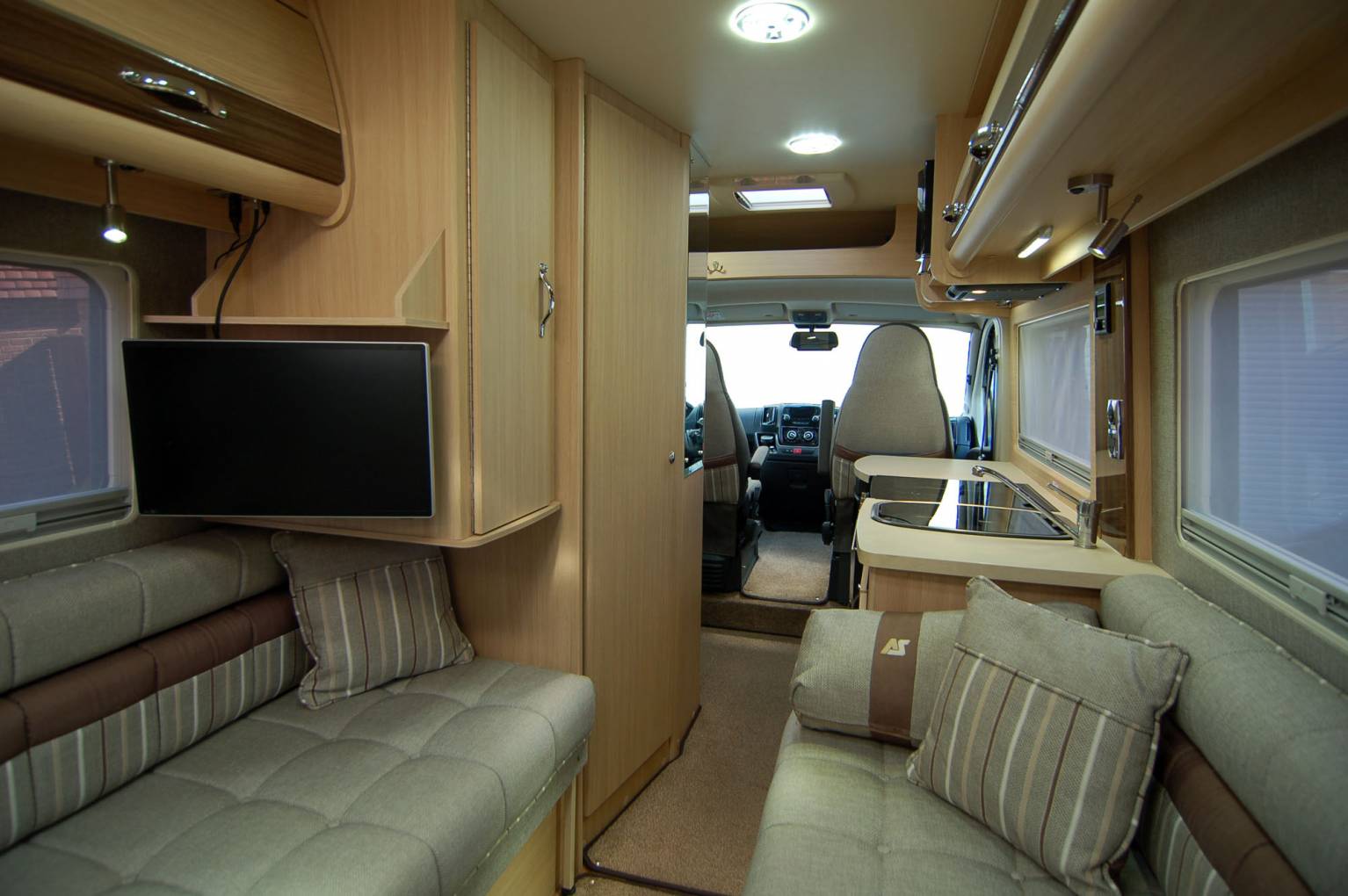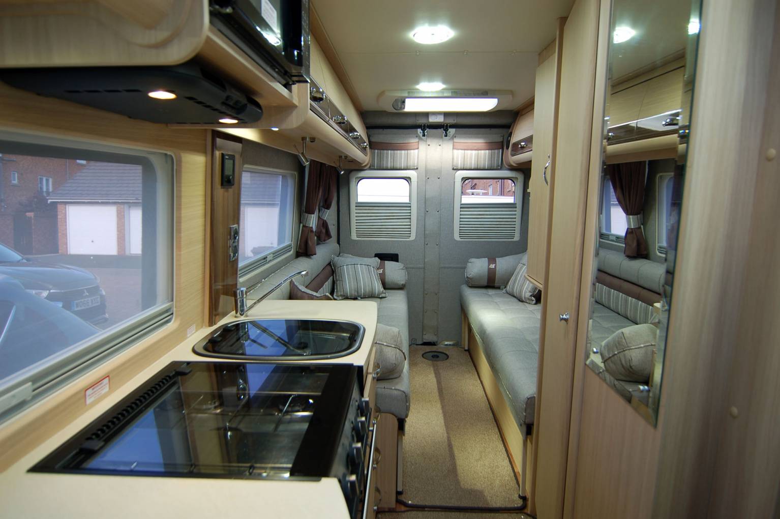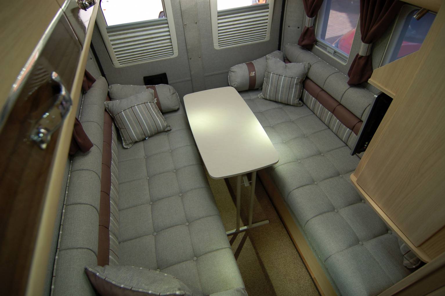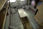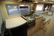 Refined and luxurious, the Warwick Duo offers a spacious rear lounge with seats long enough to use as single beds which can quickly convert into a double. There is plenty of room to relax and lots of light from plenty of windows and the large opening rooflight. A fitted Axtex TV DVD combo unit is included in the sale, mounted at just the right height. There are also two tables, a small pedastal and larger free standing one.