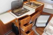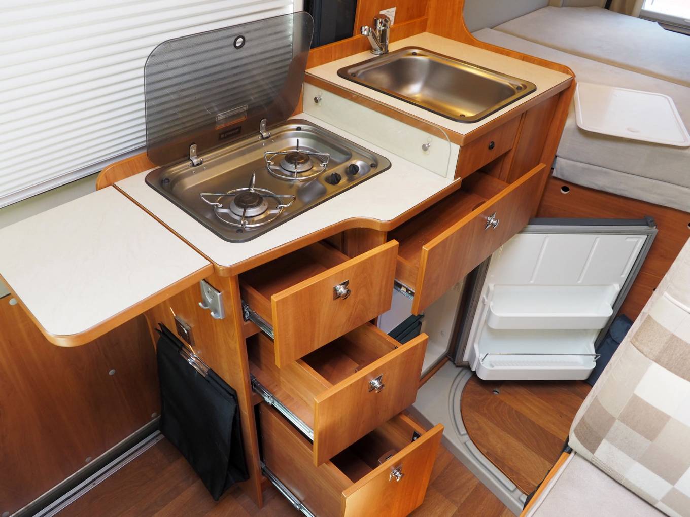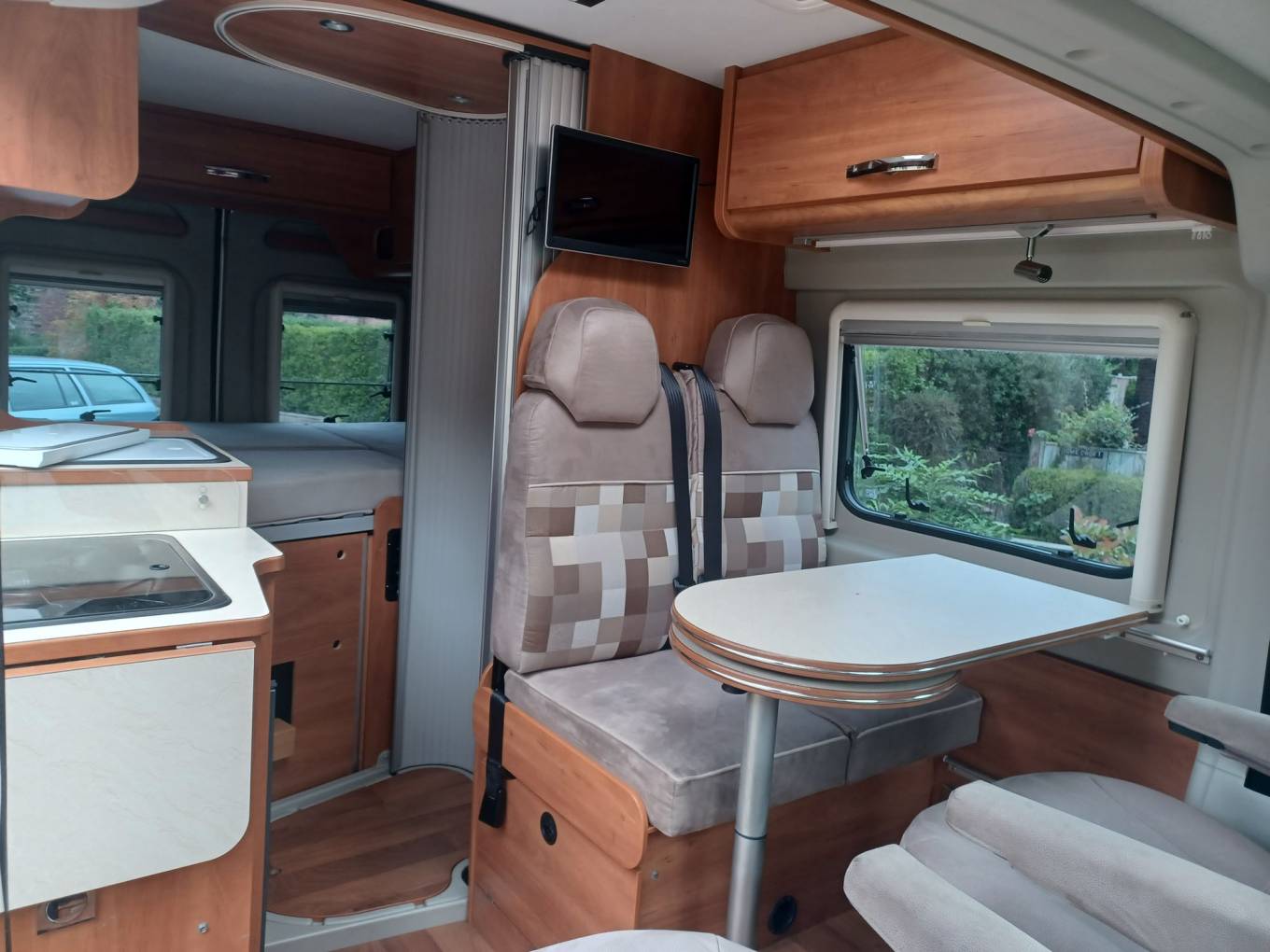 Within the compact external dimensions, there is seating for four, 4 seatbelts, washroom with shower, vanity sink and toilet, kitchen with two burner hob and fridge, onboard fresh and waste water tanks and dual fuel hot water and heating system. The cab seats swivel into the dinette to meet the side mounted table and there is a wall mounted TV. The midships kitchen offers a good amount of storage lockers and there is a variety of high and low level storage throughout. To the rear is the double bed, which is in removable sections to allow tall storage if required.