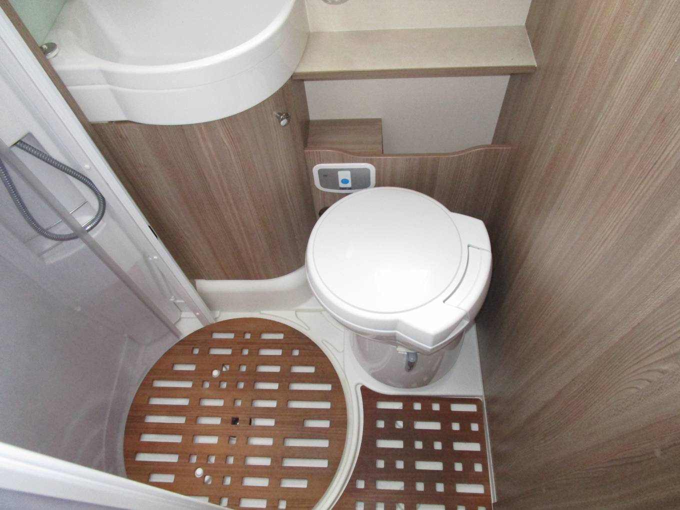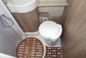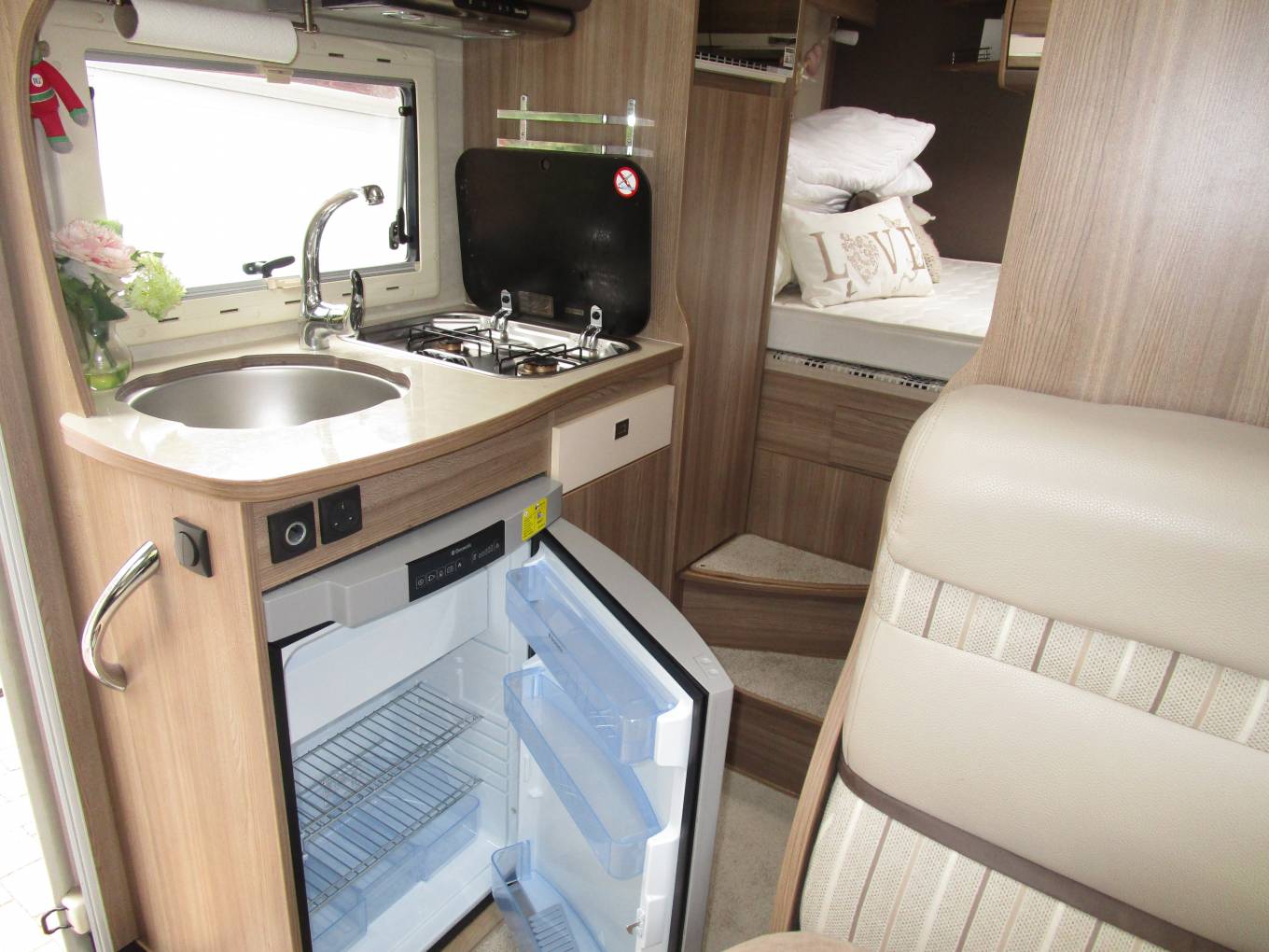 The Kitchen area is situated to the centre of the vehicle and comprises of two-ring gas burner hob, sink, fridge with small freezer compartment, extractor fan and light and combined oven and grill. The Washroom is compact however offers a separate shower cubicle, swivel Thetford cassette toilet and hand washbasin with vanity unit.