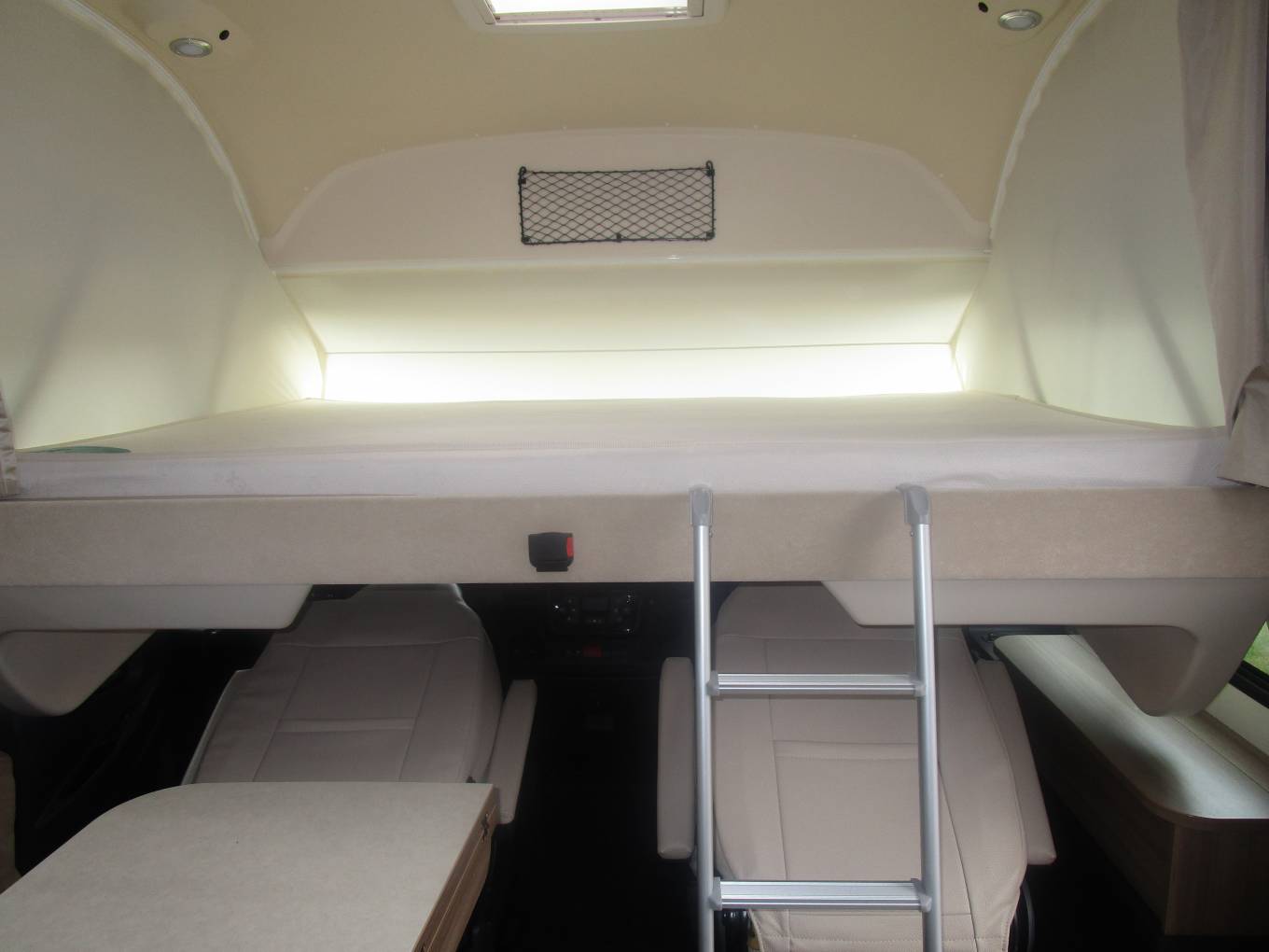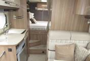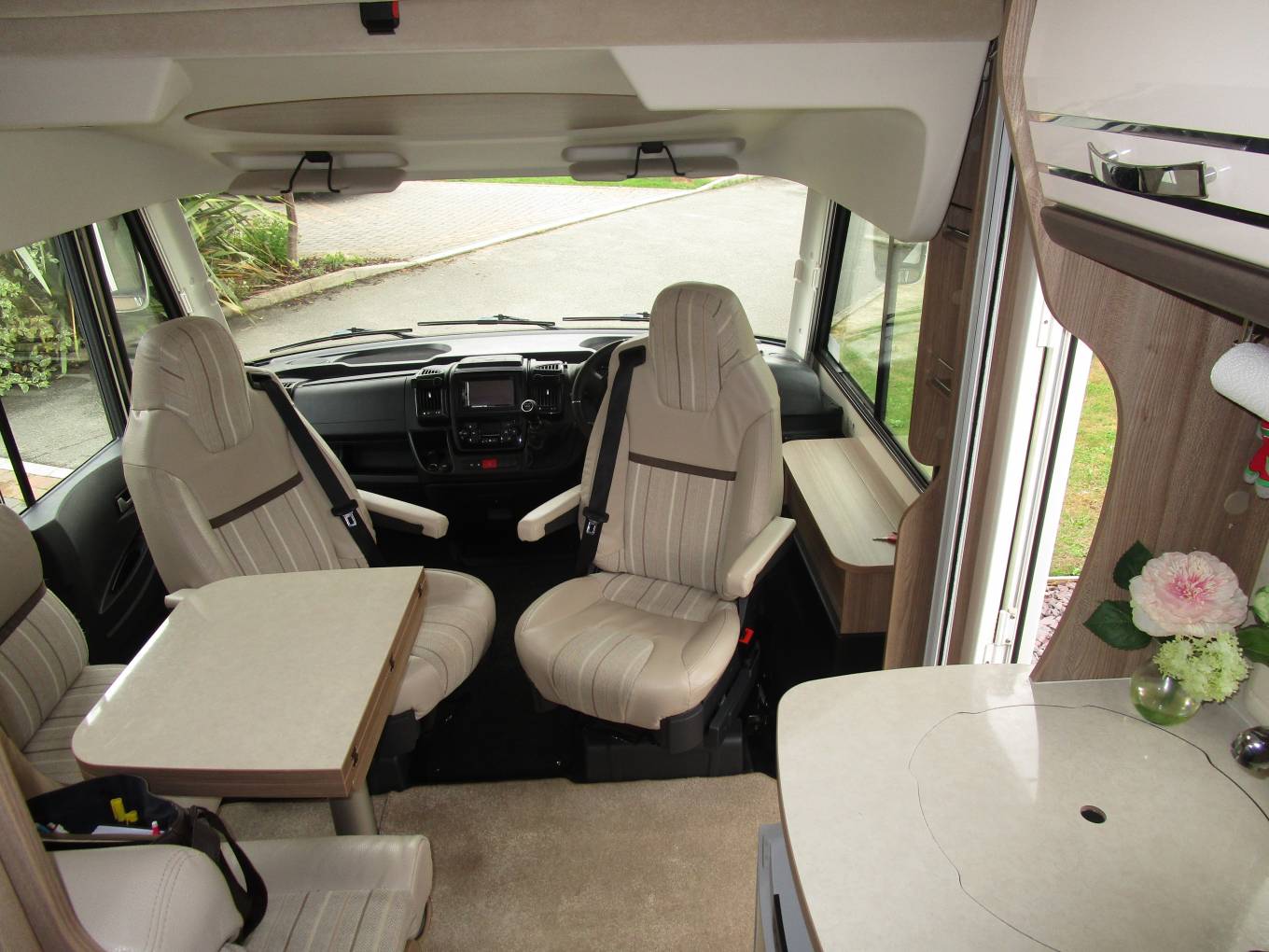The motorhome is finished in cream half leather upholstery and high gloss carpentry.
