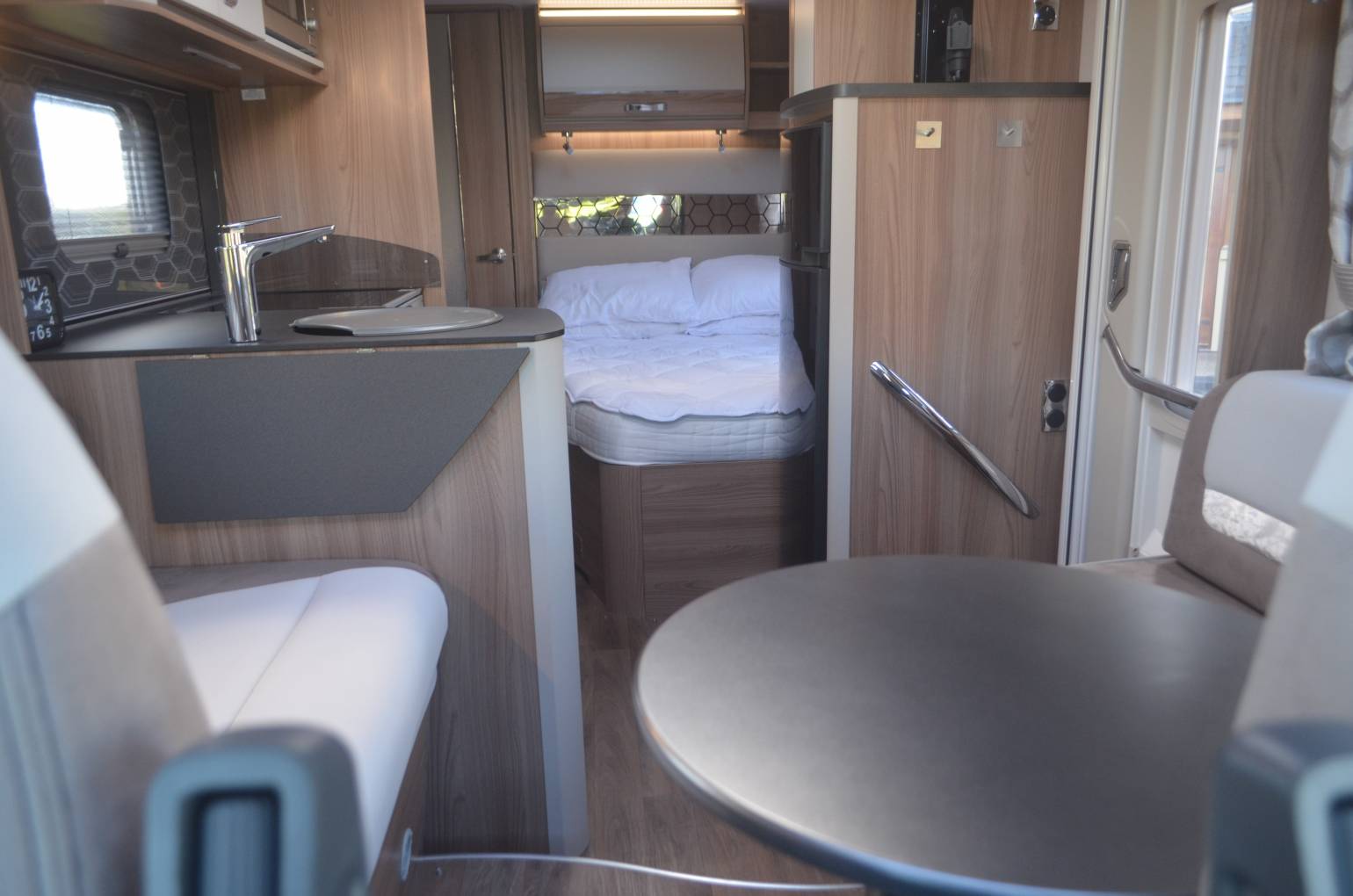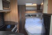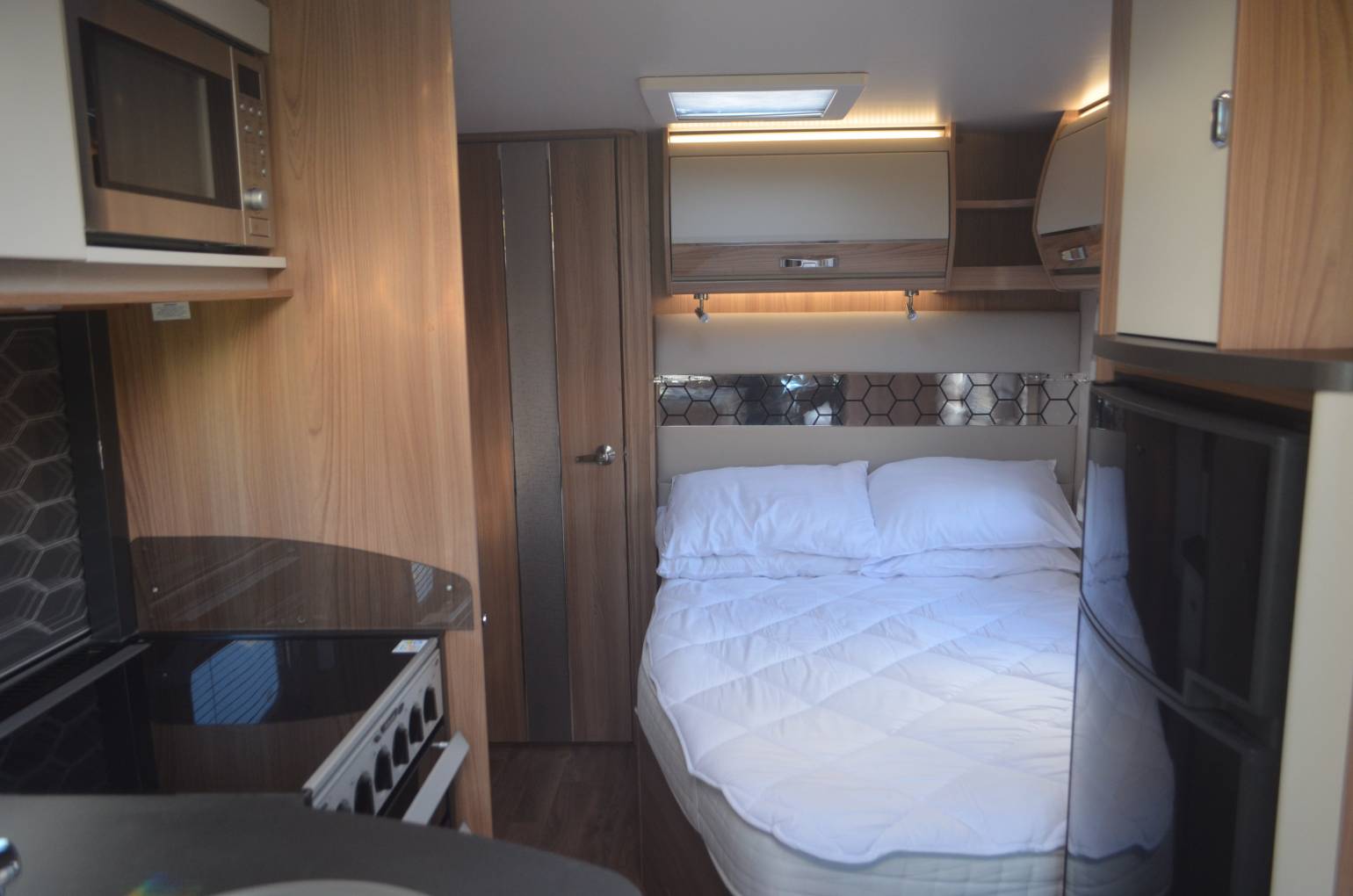 The fixed french bed is comfortable and has additional storage underneath. You have a privacy blind between the lounge and bedroom area. Great storage throughout the habitation area.