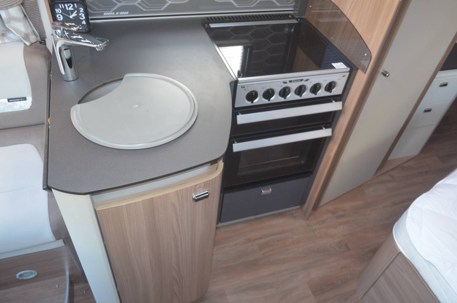 Mid ship kitchen is fully equipped with a full sized cooker, oven, grill, 4 burner gas hob, omnivent fan, stainless steel sink with mixer taps and a 3 way fridge freezer.